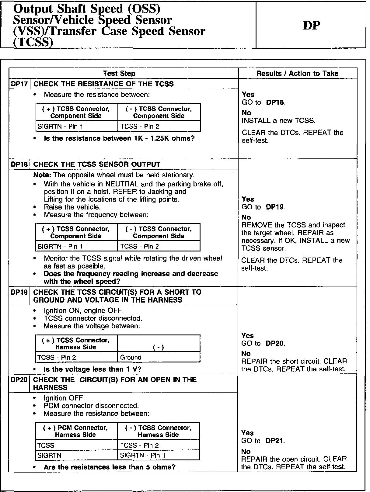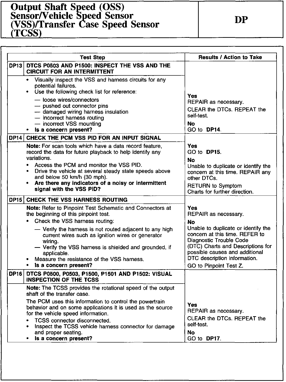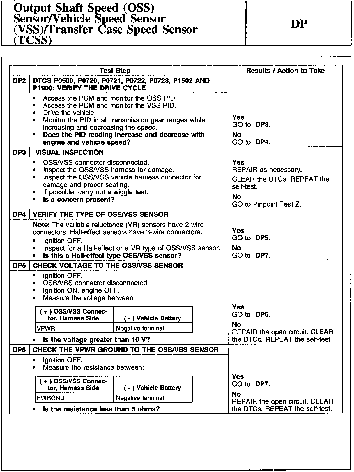 Home >> Ford >> 2009 >> F 150 2WD V8-5.4L Flex Fuel >> Repair and Diagnosis >> Powertrain Management >> Computers and Control Systems >> Testing and Inspection >> Pinpoint Tests >> DP - Output Shaft Speed (OSS) Sensor/Vehicle Speed Sensor (VSS)/Transfer Case Speed Sensor (TCSS)