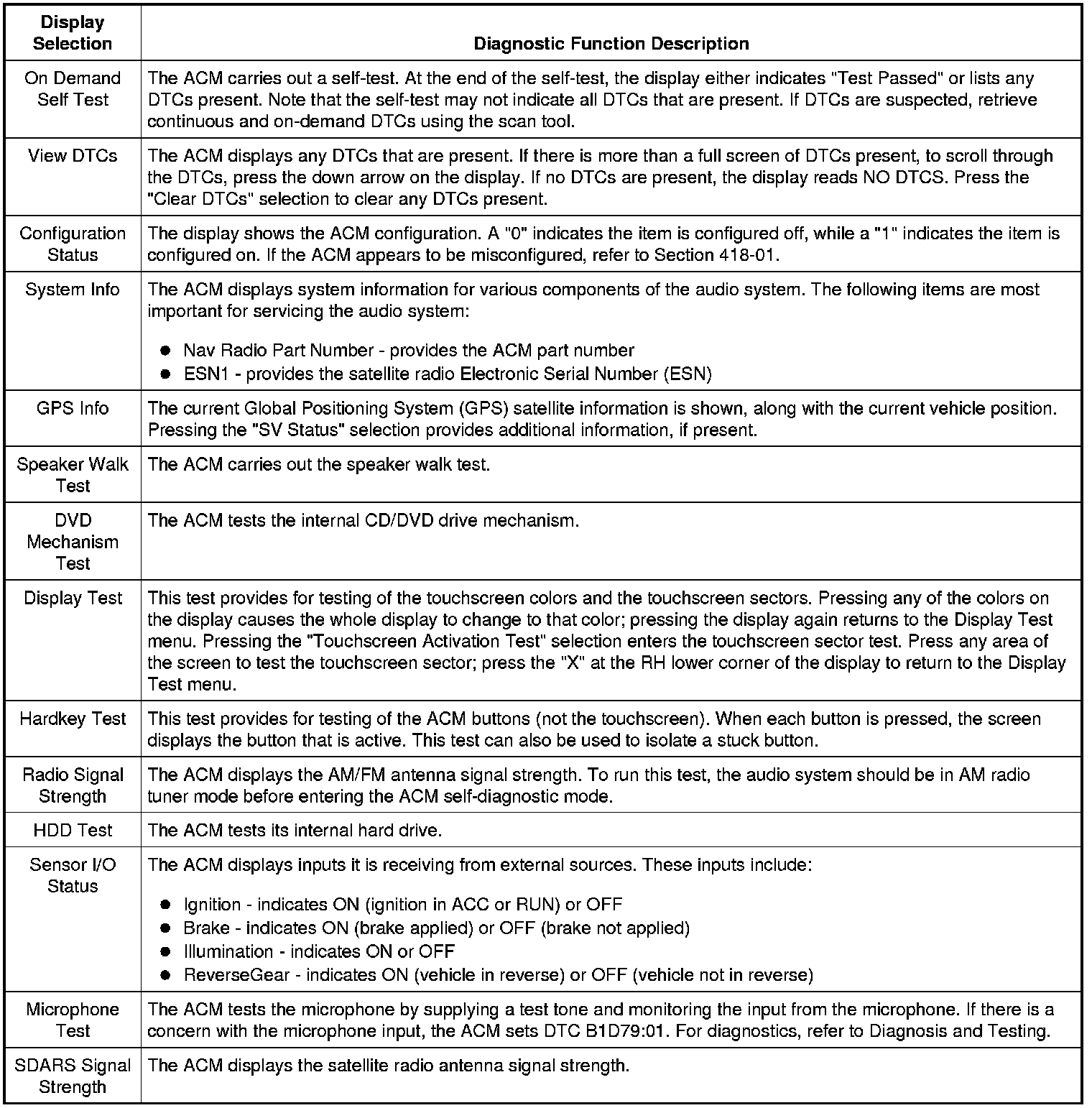 Home >> Ford >> 2009 >> Flex AWD V6-3.5L >> Repair and Diagnosis >> Accessories and Optional Equipment >> Cellular Phone >> Communications Control Module >> Service and Repair >> Procedures >> Audio Control Module (ACM) Self-Diagnostic Mode