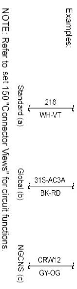Connector Views show the views of the pins and/or cavities of all connectors. The pin and cavity sides are shown separately as if the connector were disconnected. The color of the connector housing is indicated next to the connector number when available. The harness causal number is located above the connector view and below the connector number. The circuit function charts are located below each connector. The wiring harness designations are listed in Component Location Charts.