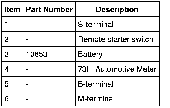 1. Connect the 73III Automotive Meter positive lead to the starter motor housing (the connection must be clean and free of rust or grease). Connect the negative lead to the negative (-) battery terminal.