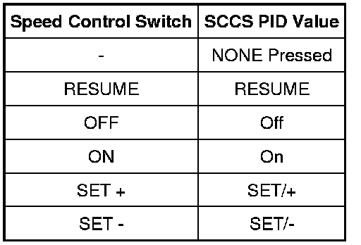 - Press each speed control switch button while monitoring the speed control switch PID (SCCS).