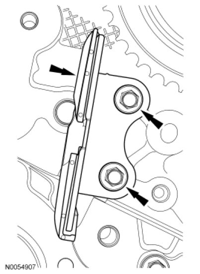 Install the RH primary timing chain guide and the 2 bolts.Tighten to 10 Nm (89 lb-in).