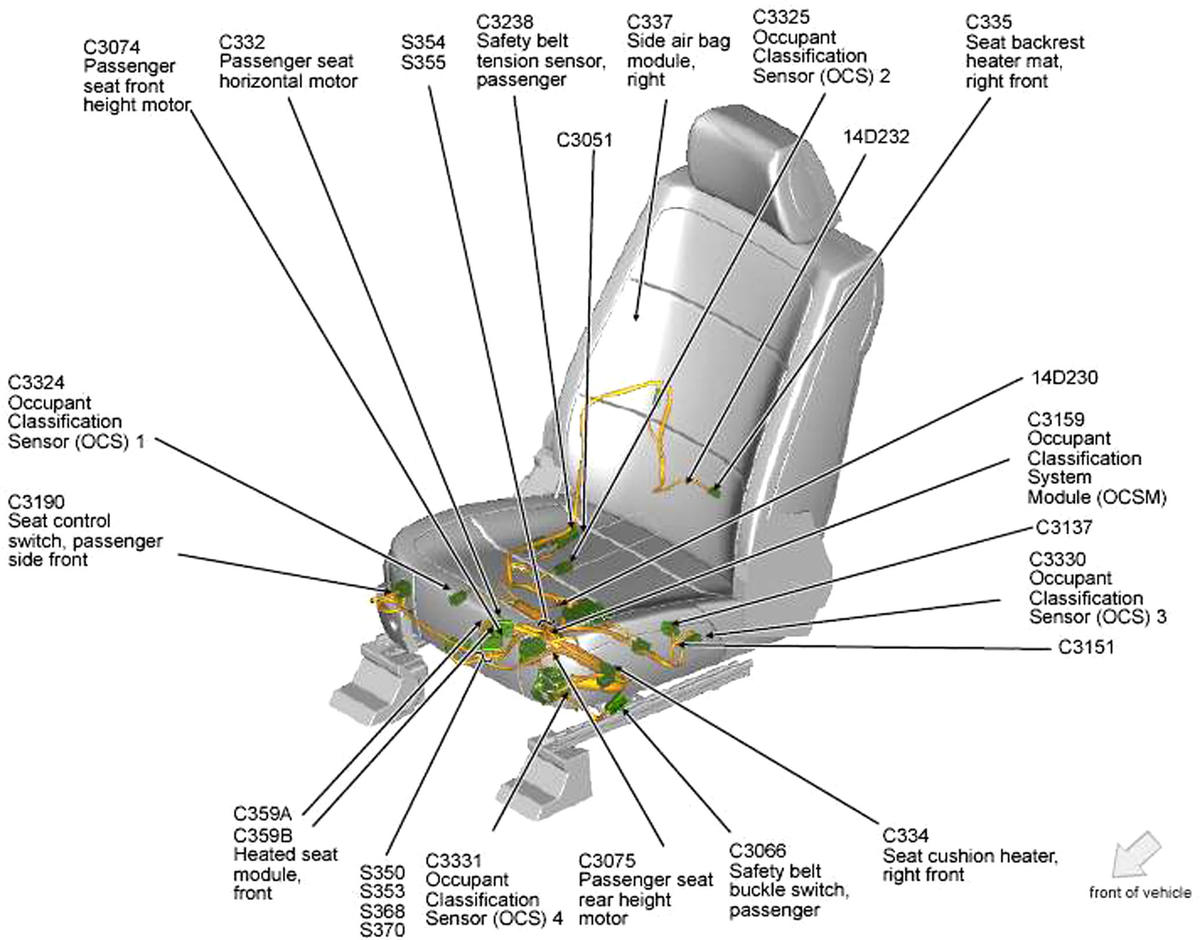 | Occupant Classification System Module (OCSM) | Under front passenger's seat. See Figure. |