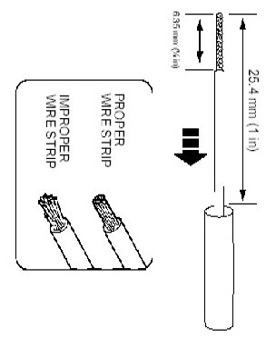 2. Strip 6.35mm (1/4 in) of insulation from each wire end, taking care not to nick or cut wire strands.