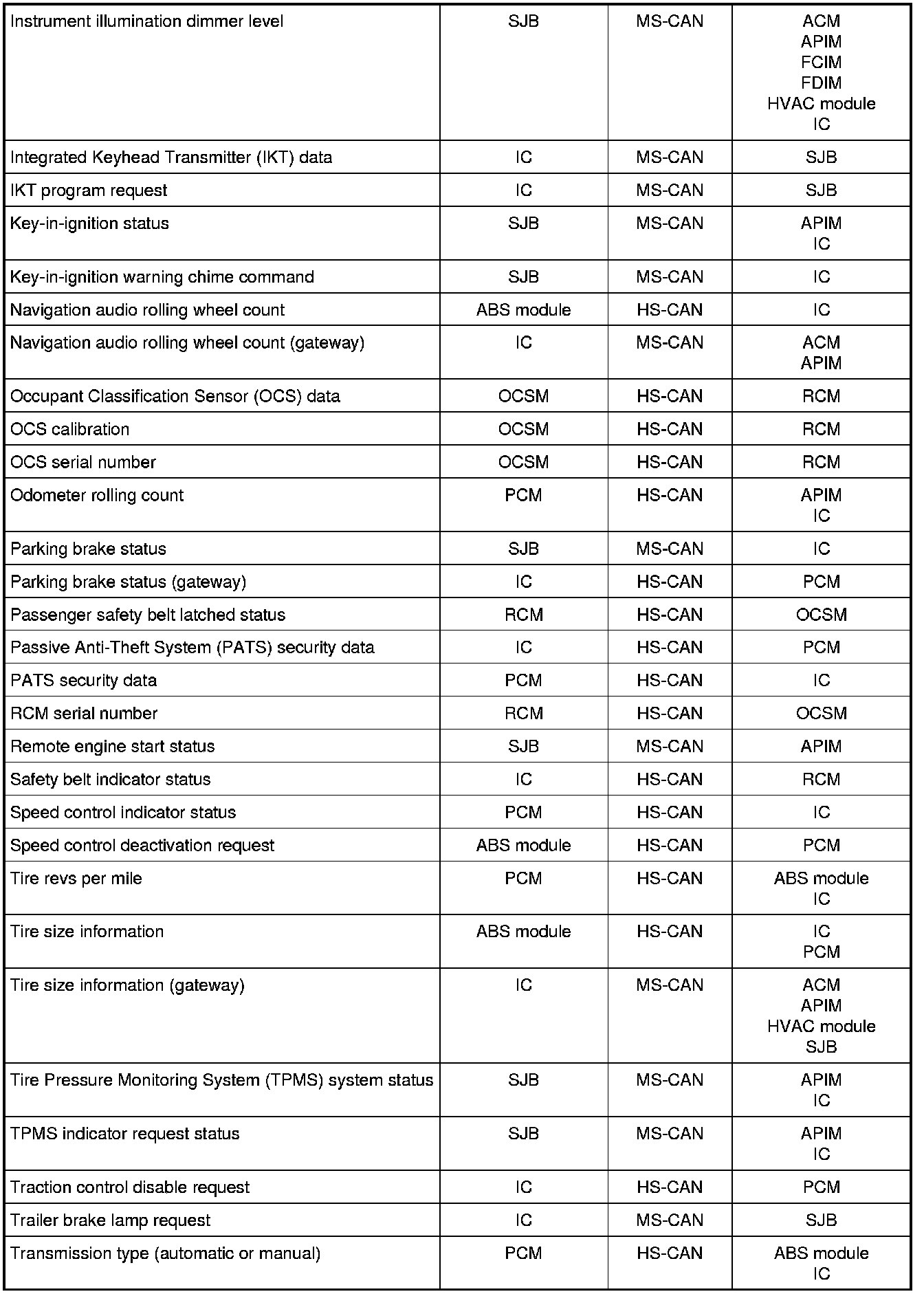 The following chart describes the specific HS-CAN messages broadcast by each module, and the module(s) that receive the message: