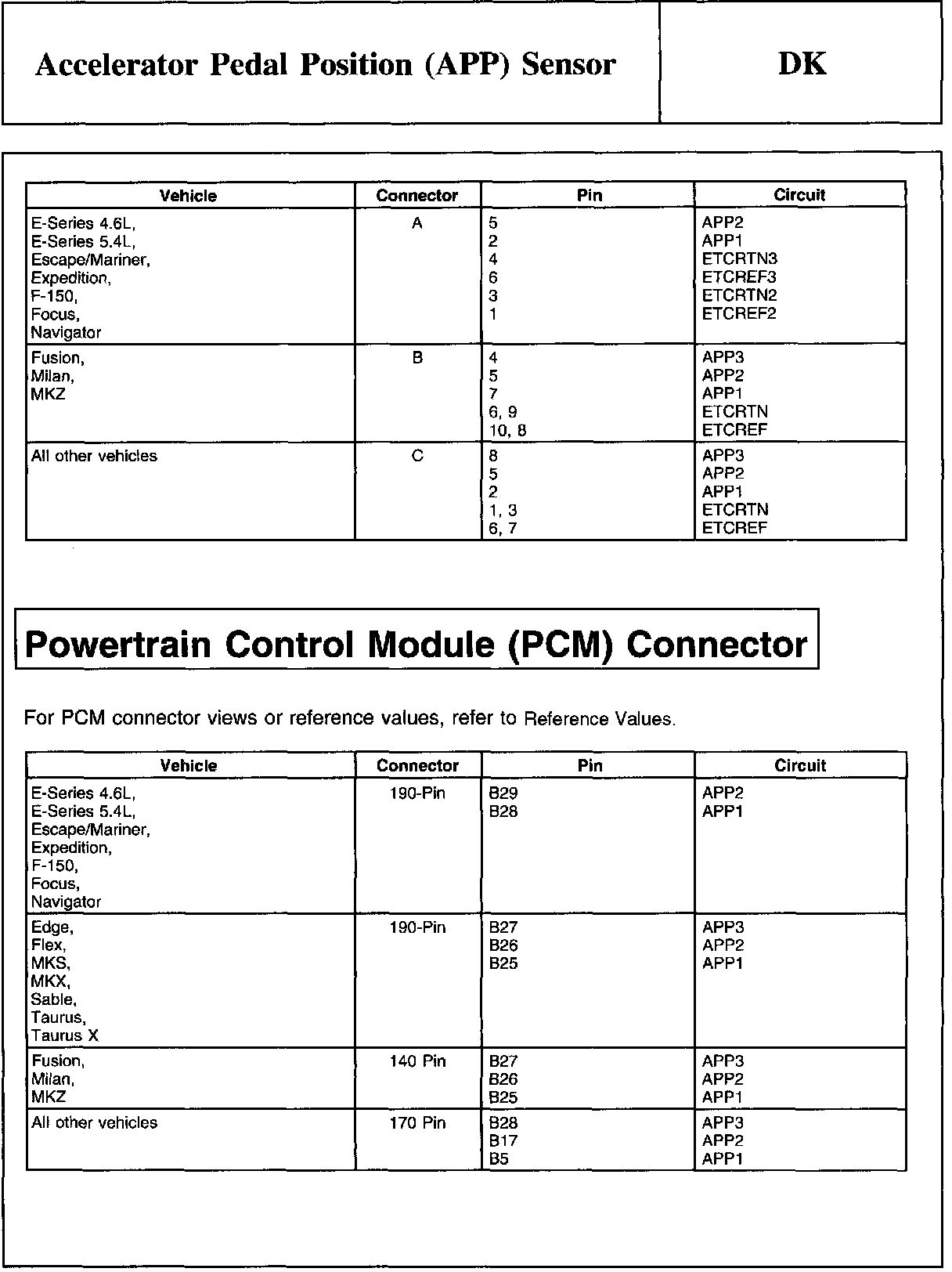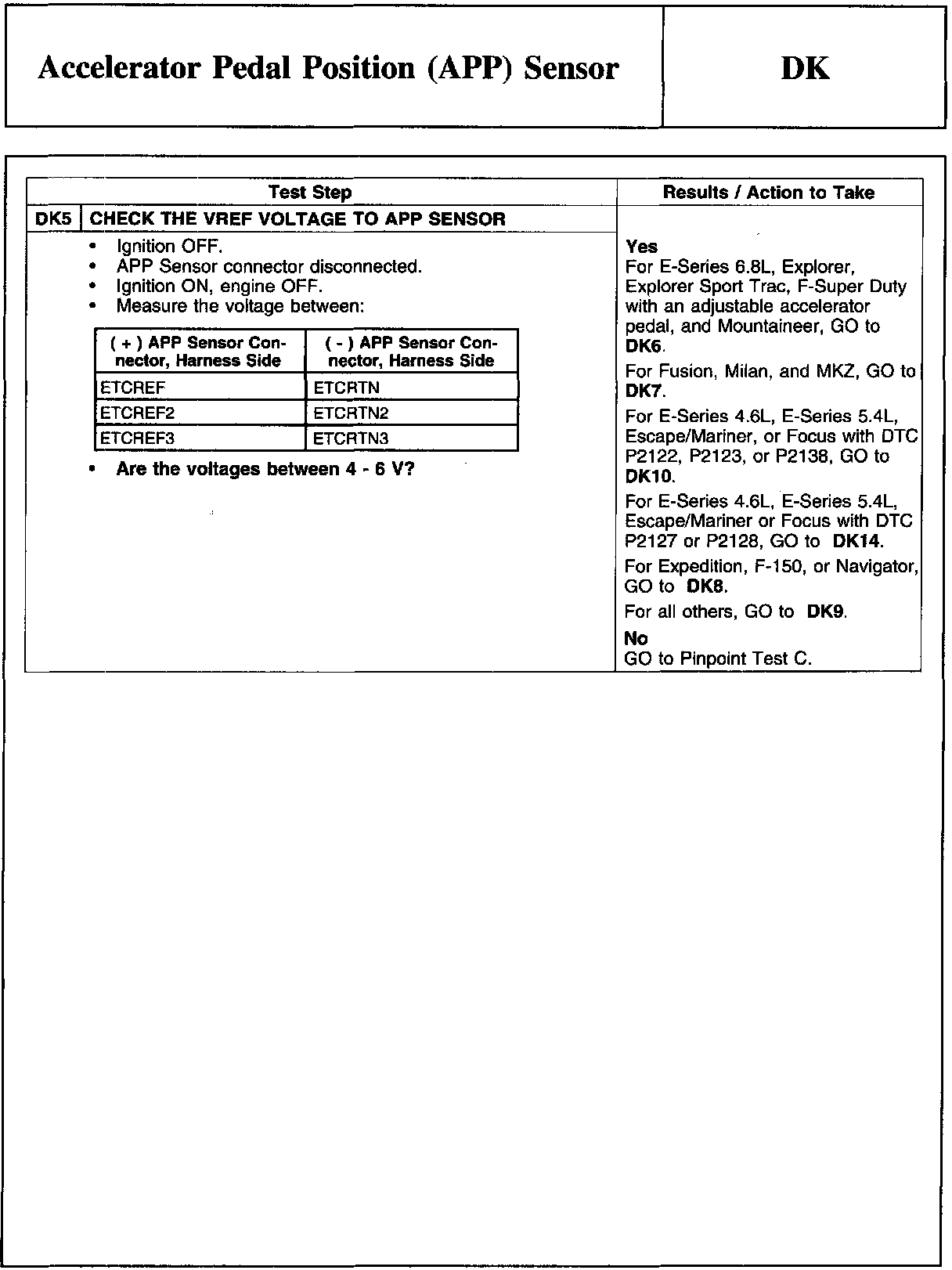 Home >> Ford >> 2009 >> Focus L4-2.0L >> Repair and Diagnosis >> Powertrain Management >> Computers and Control Systems >> Testing and Inspection >> Pinpoint Tests >> DK - Accelerator Pedal Position (APP) Sensor