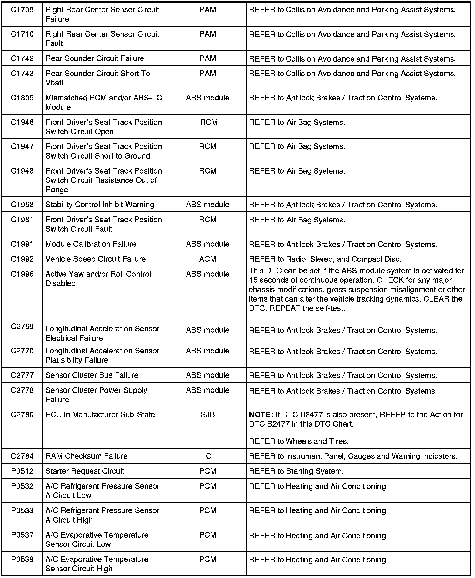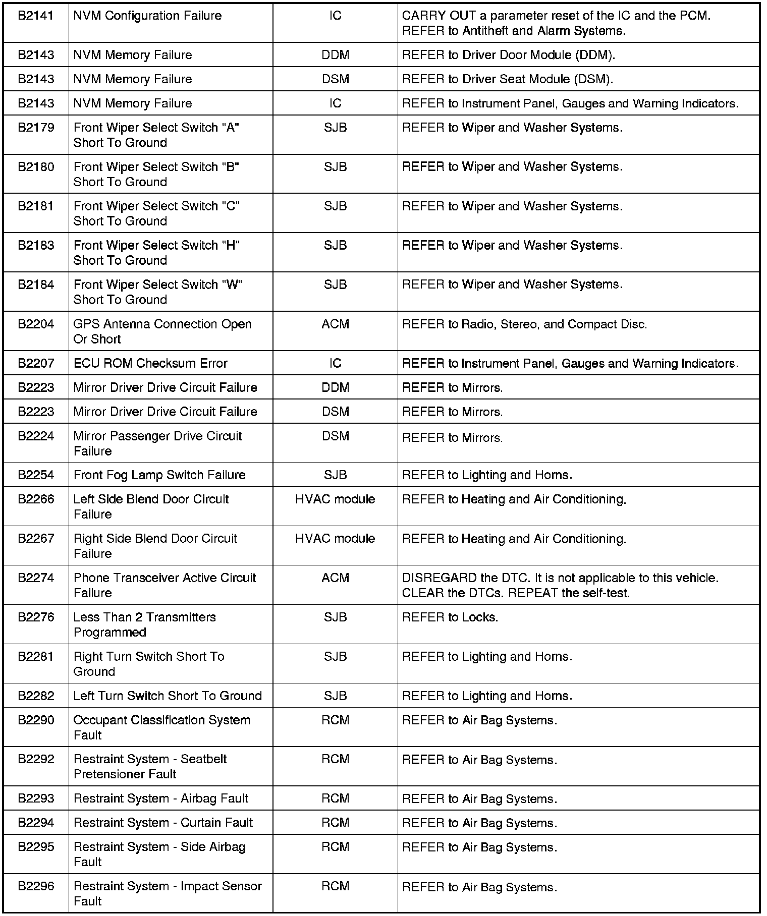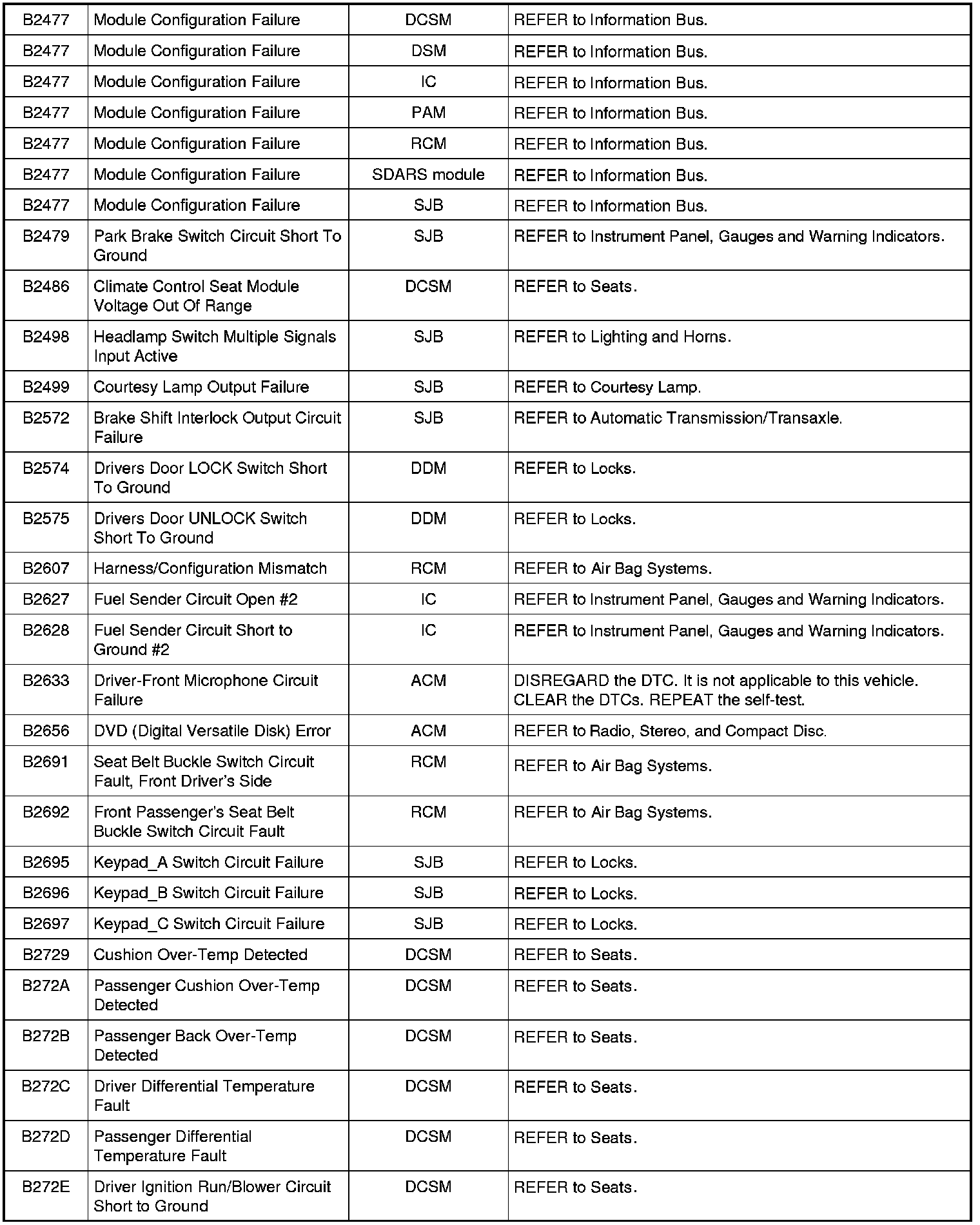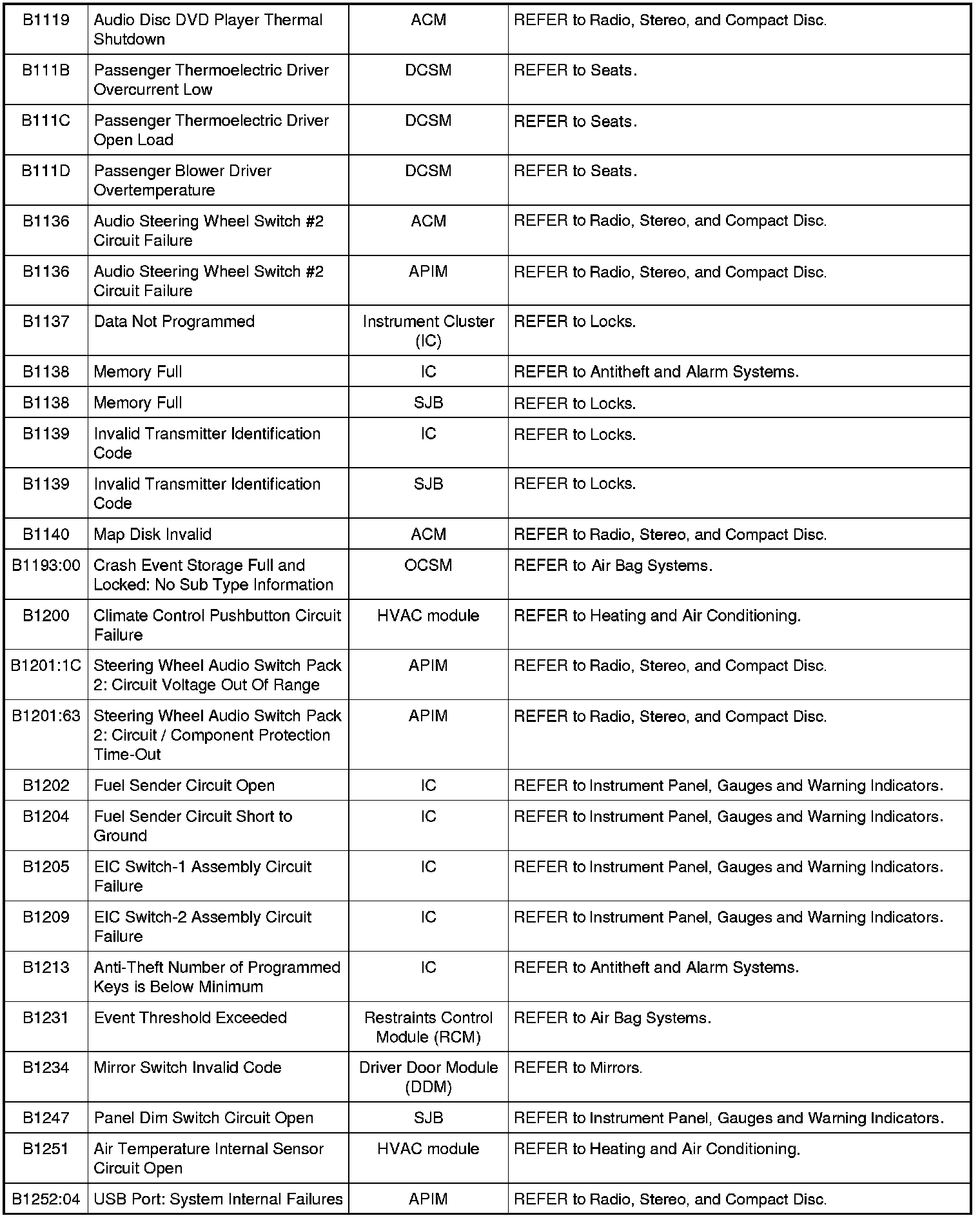 Home >> Ford >> 2009 >> Fusion AWD L4-2.3L >> Repair and Diagnosis >> Body and Frame >> Body Control Systems >> Testing and Inspection >> Diagnostic Trouble Code Descriptions >> Diagnostic Trouble Code (DTC) Chart