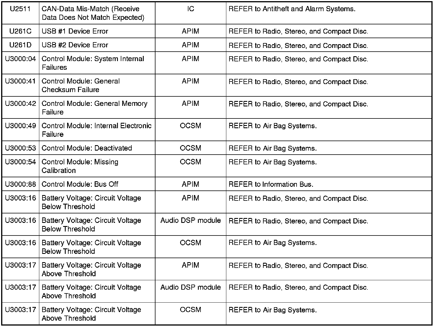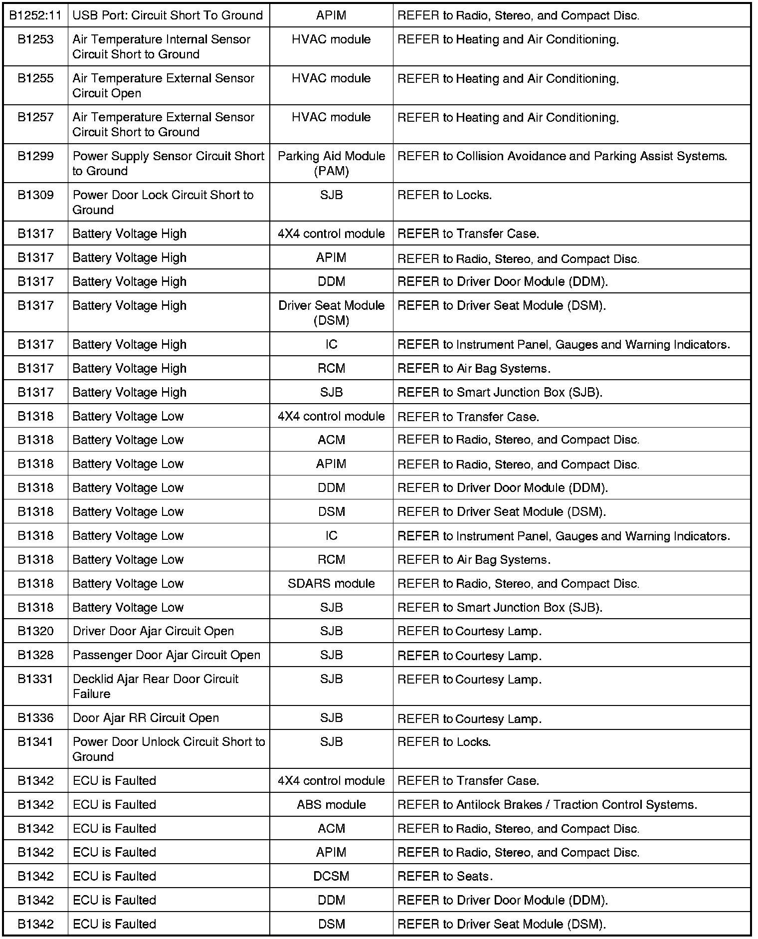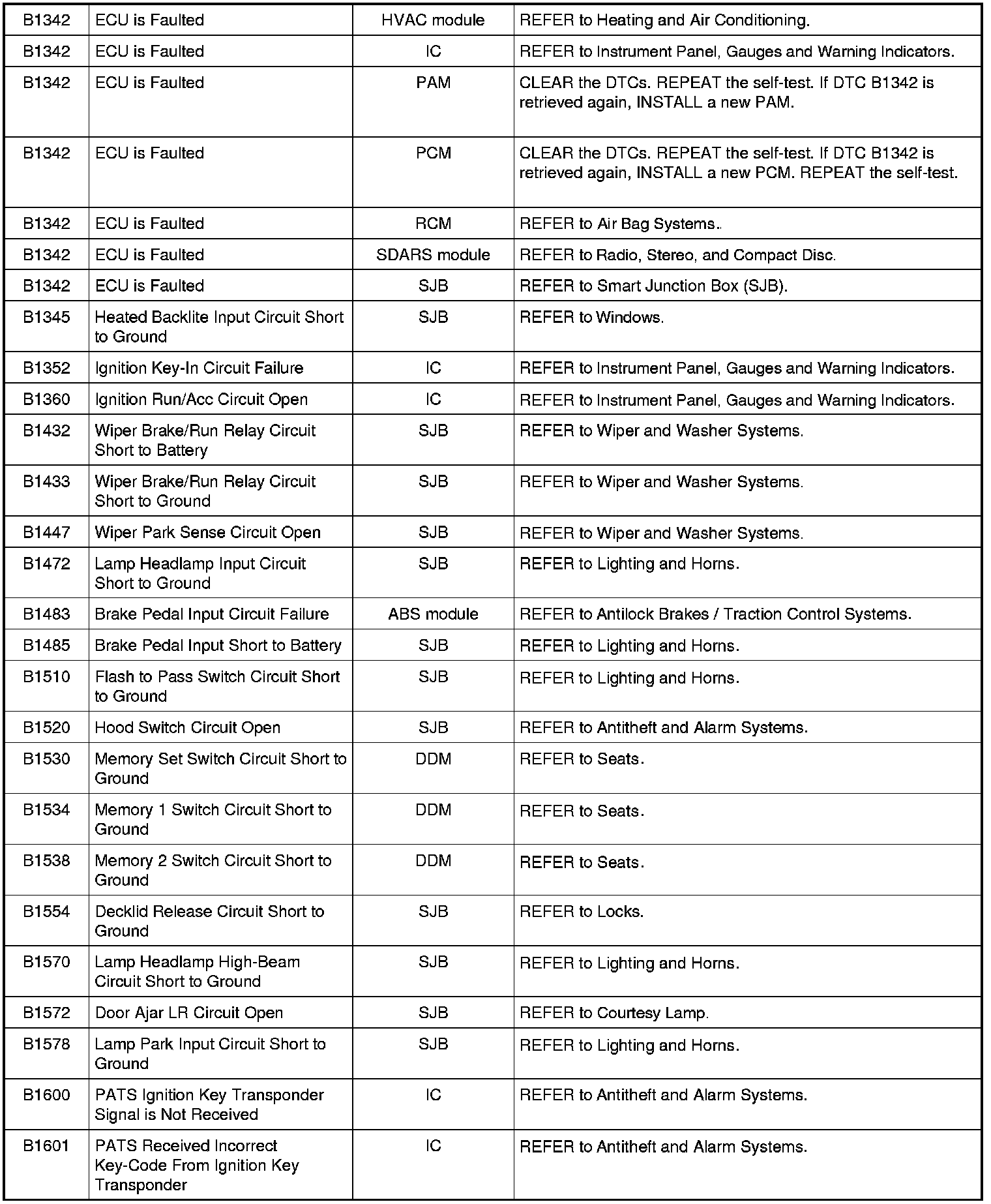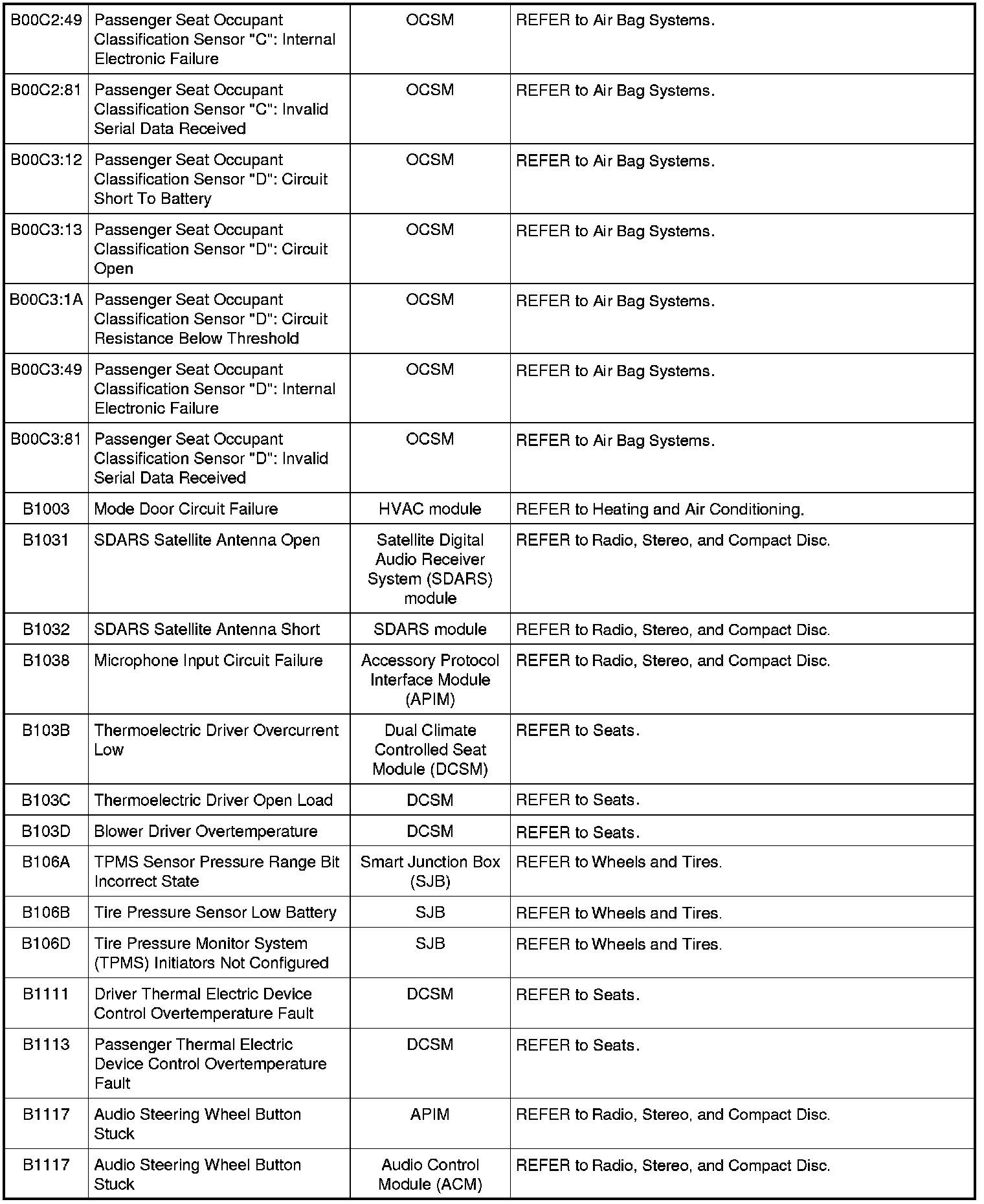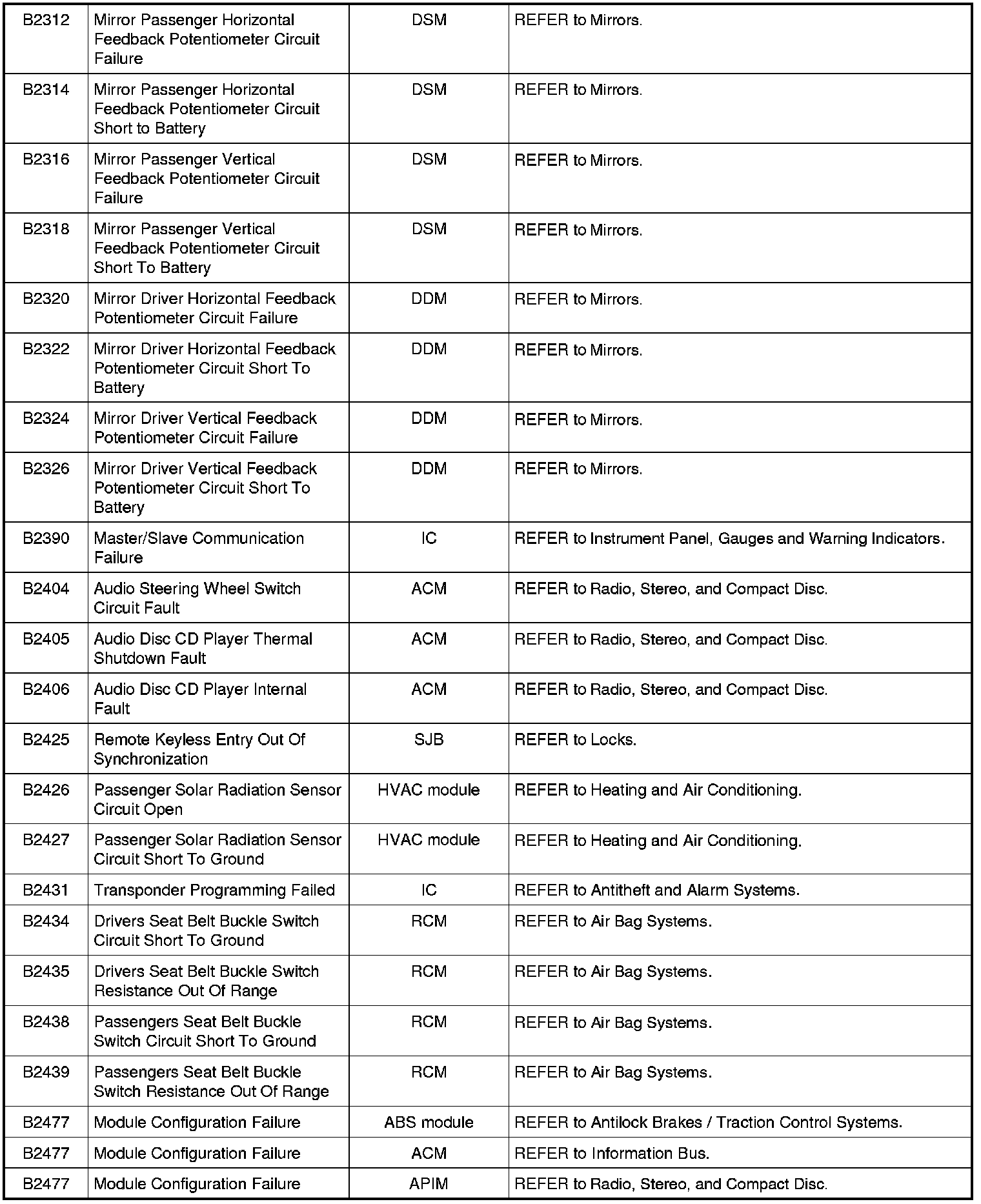 Home >> Ford >> 2009 >> Fusion AWD L4-2.3L >> Repair and Diagnosis >> Body and Frame >> Body Control Systems >> Testing and Inspection >> Diagnostic Trouble Code Descriptions >> Diagnostic Trouble Code (DTC) Chart