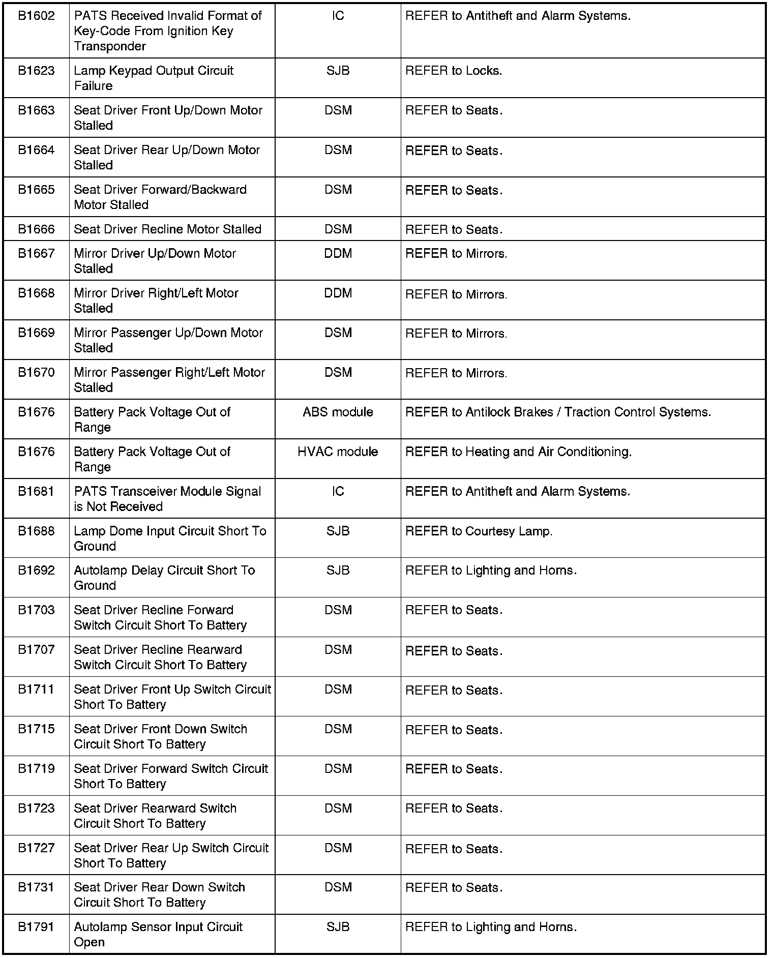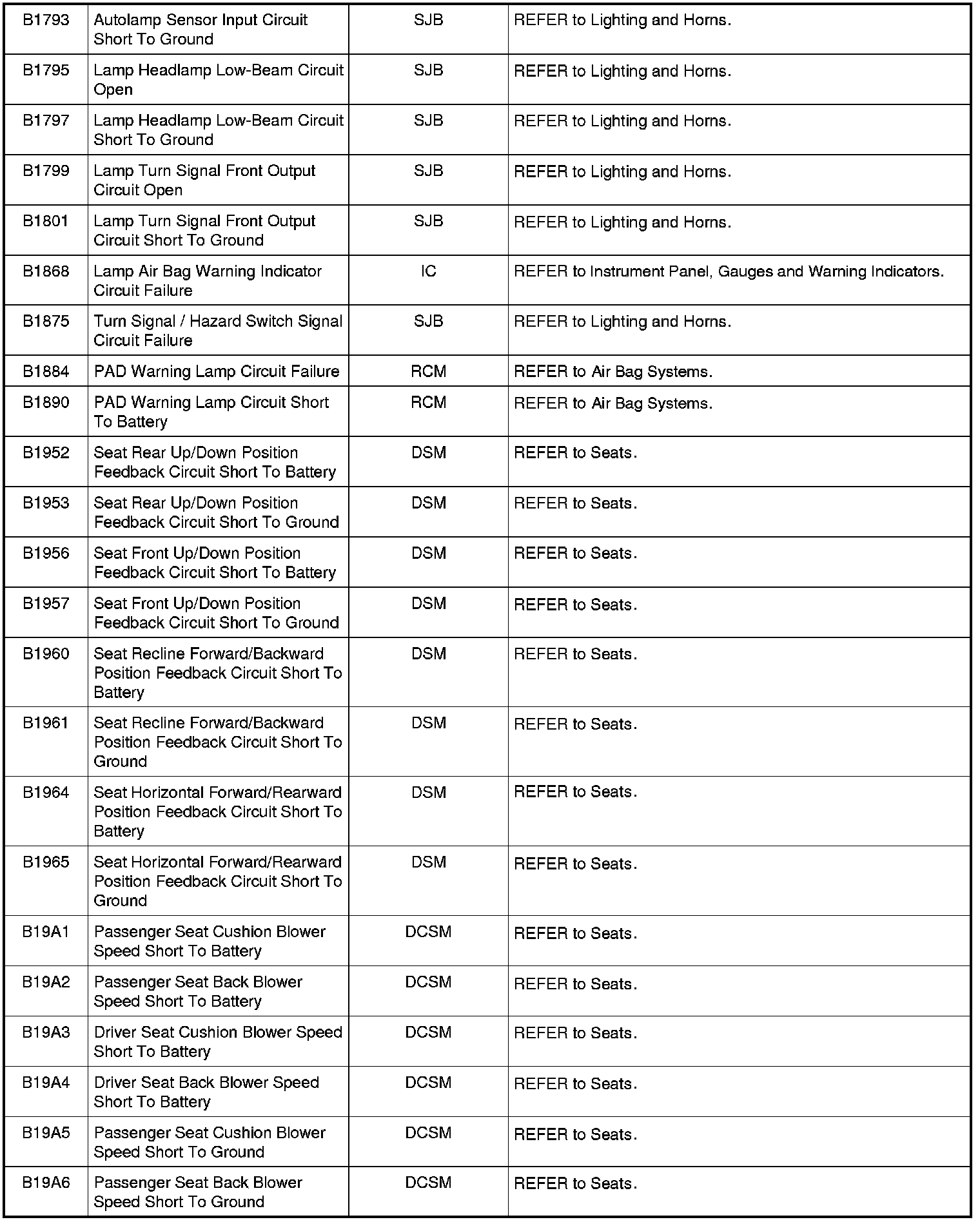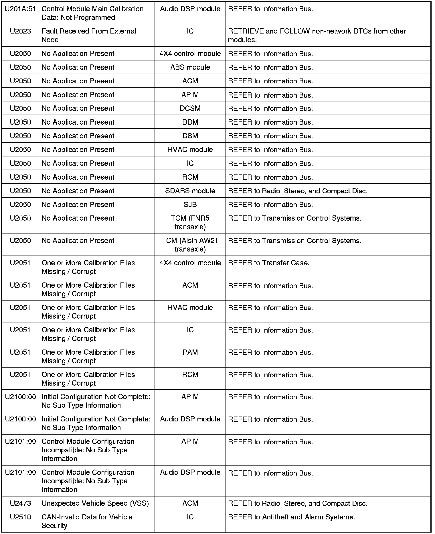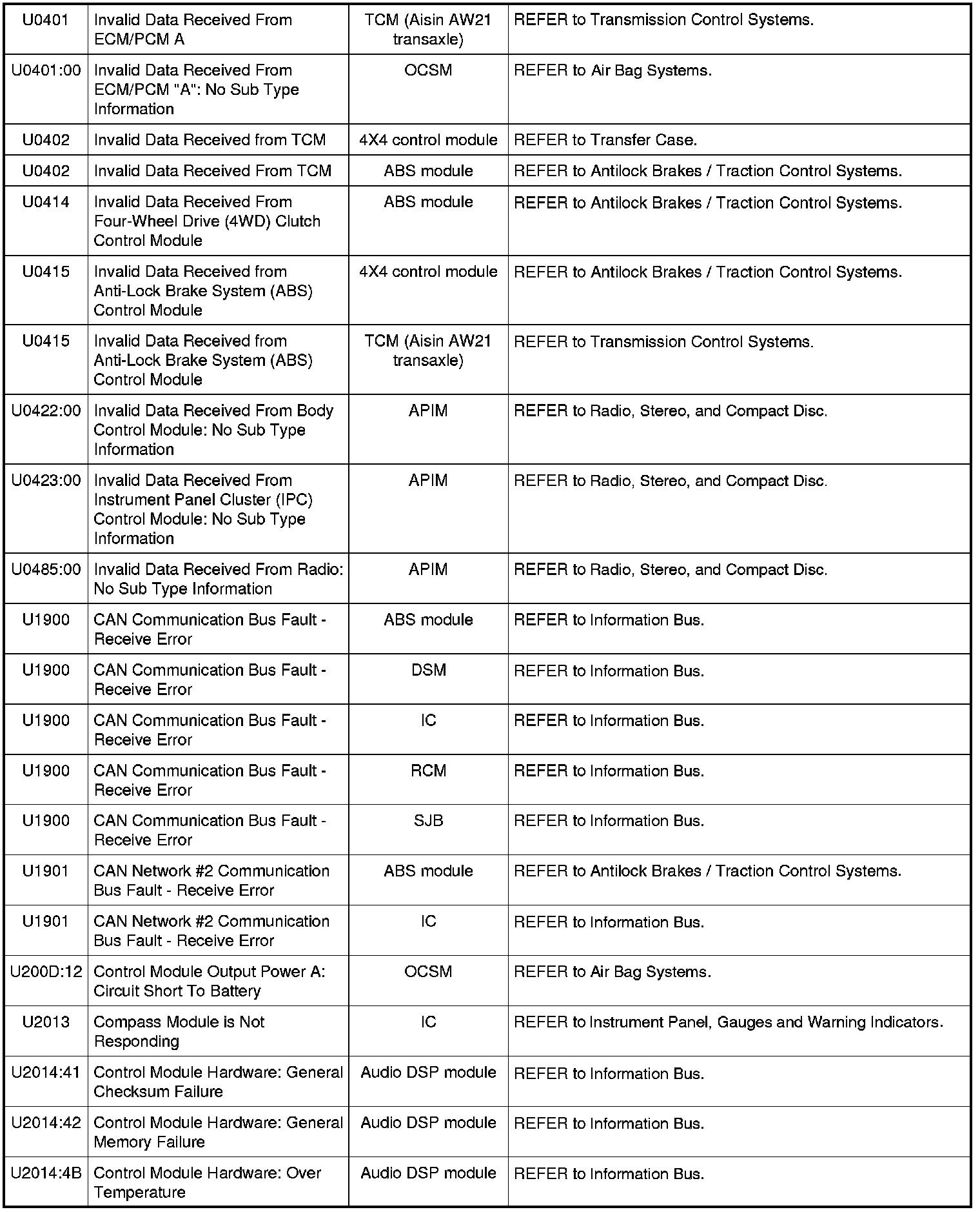 Home >> Ford >> 2009 >> Fusion AWD L4-2.3L >> Repair and Diagnosis >> Body and Frame >> Body Control Systems >> Testing and Inspection >> Diagnostic Trouble Code Descriptions >> Diagnostic Trouble Code (DTC) Chart