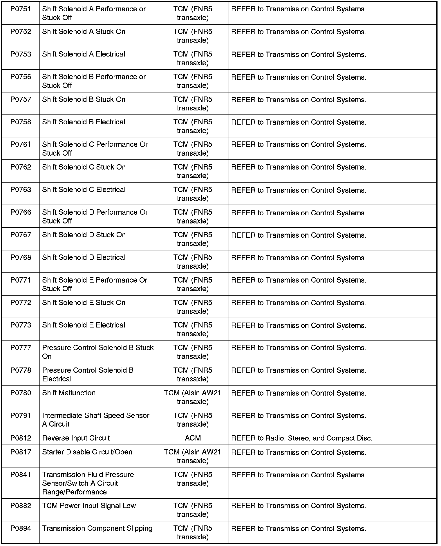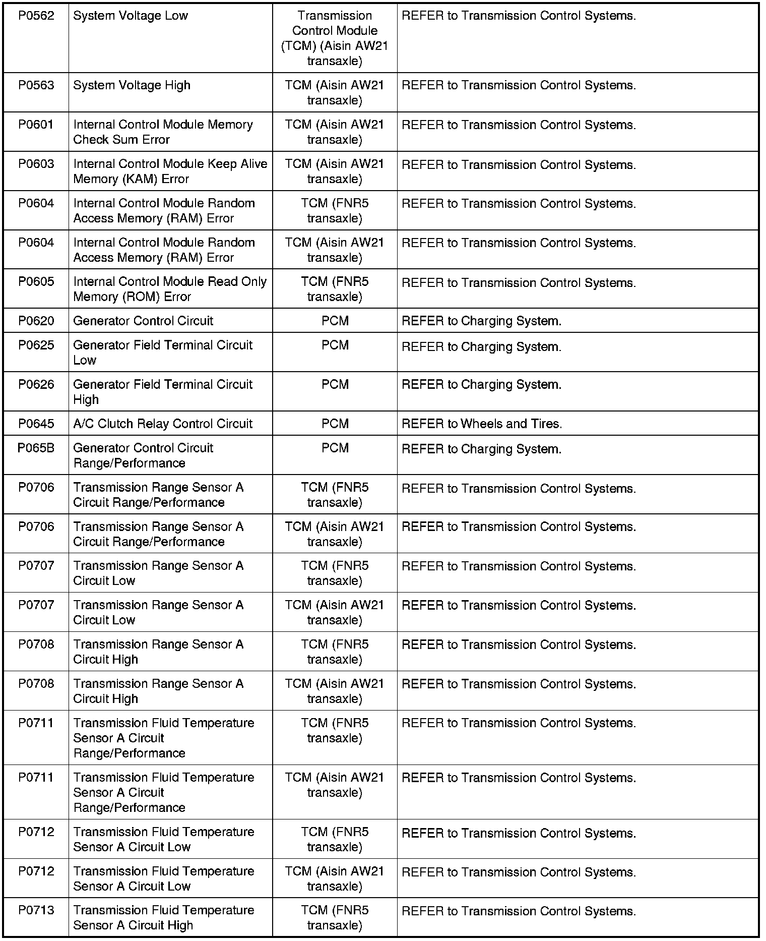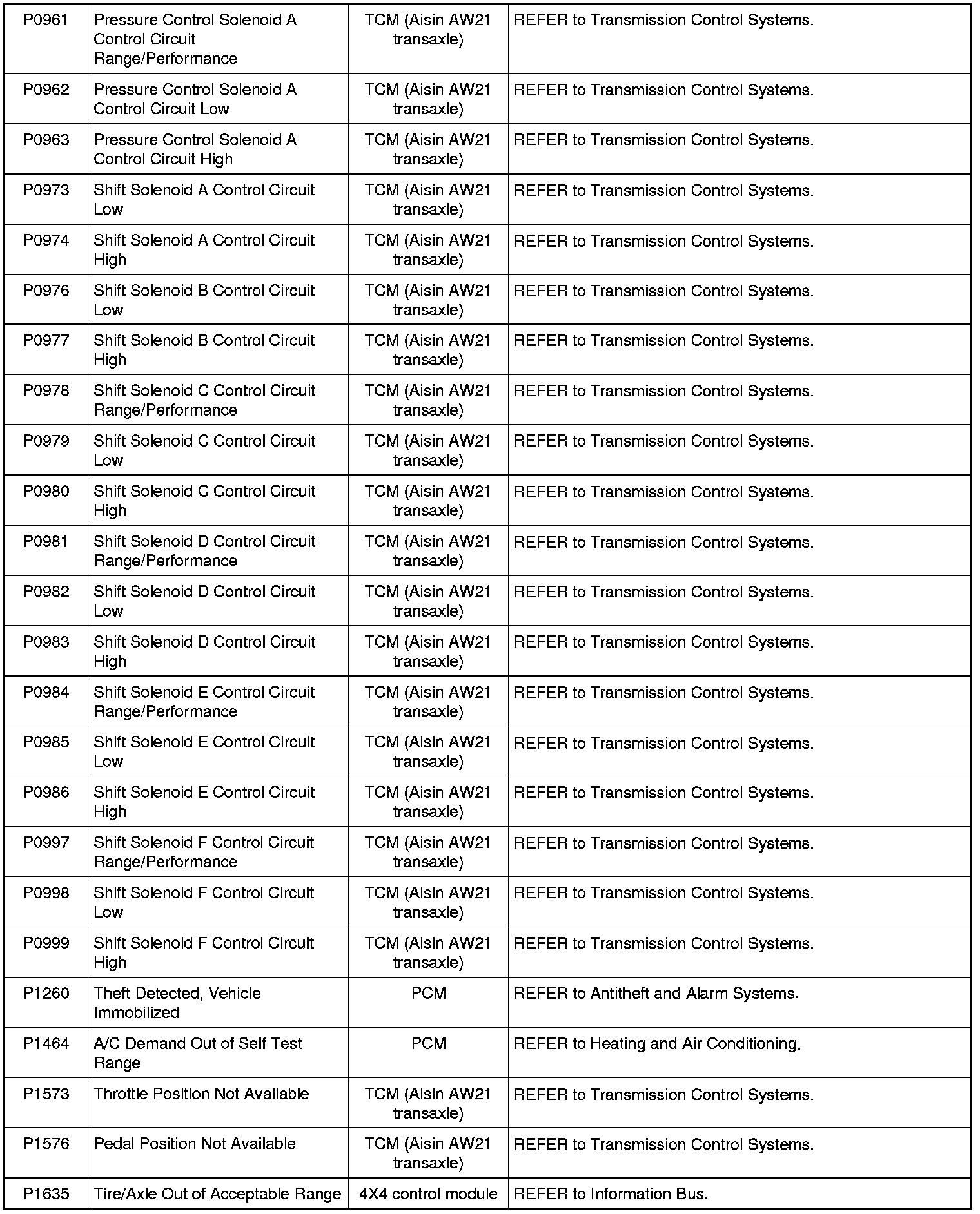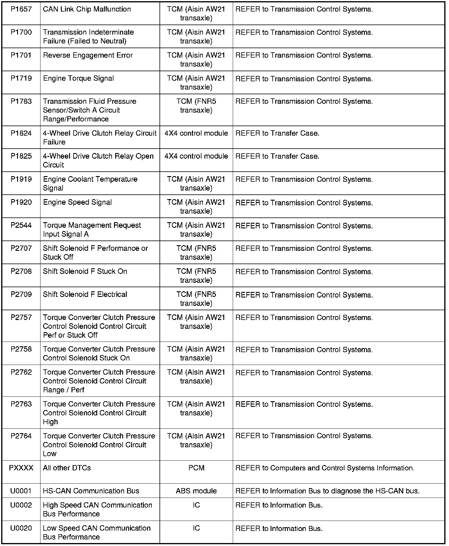 NOTE: Most powertrain (P-code) DTCs are diagnosed in Computers and Control Systems Information. If the P-code retrieved is not listed below, refer to Computers and Control Systems Information to continue diagnostics.