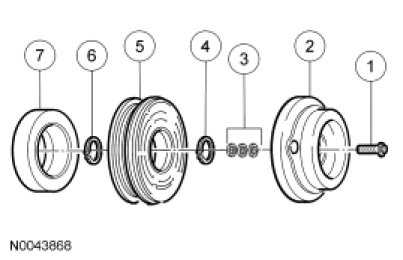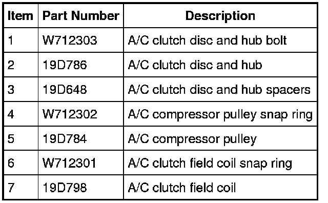 NOTE: Internal A/C compressor components are not serviced separately. The A/C compressor is serviced only as an assembly. The clutch disc and hub, A/C compressor pulley and bearing and clutch field coil are serviceable.