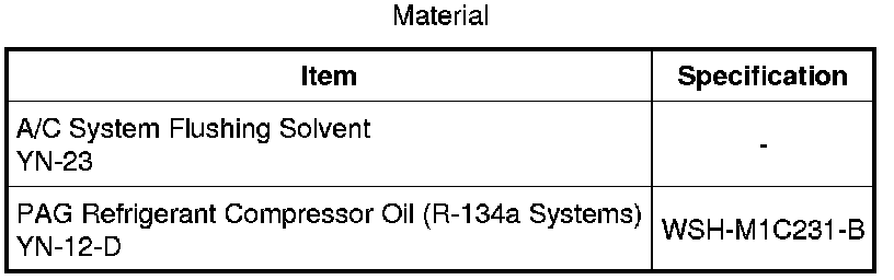 NOTICE: Receiver/drier cartridge, Thermostatic Expansion Valve (TXV), and hoses with mufflers should be removed when flushing the air conditioning (A/C) system. Internal plumbing of these devices makes it impossible to correctly remove any residual-flushing agent. These components are typically discarded after A/C system contamination. Hoses without mufflers can normally be reused unless they are clogged with foreign material. The 3.785L (1 gal) of A/C System Flushing Solvent YN-23 and FL1-A filter used in A/C Flush and Purge Machine 219-00022 are intended for use on one vehicle only. They may be used to flush both the A/C condenser core and the A/C evaporator core on an individual vehicle, but under no circumstances should they be used on more than one vehicle.