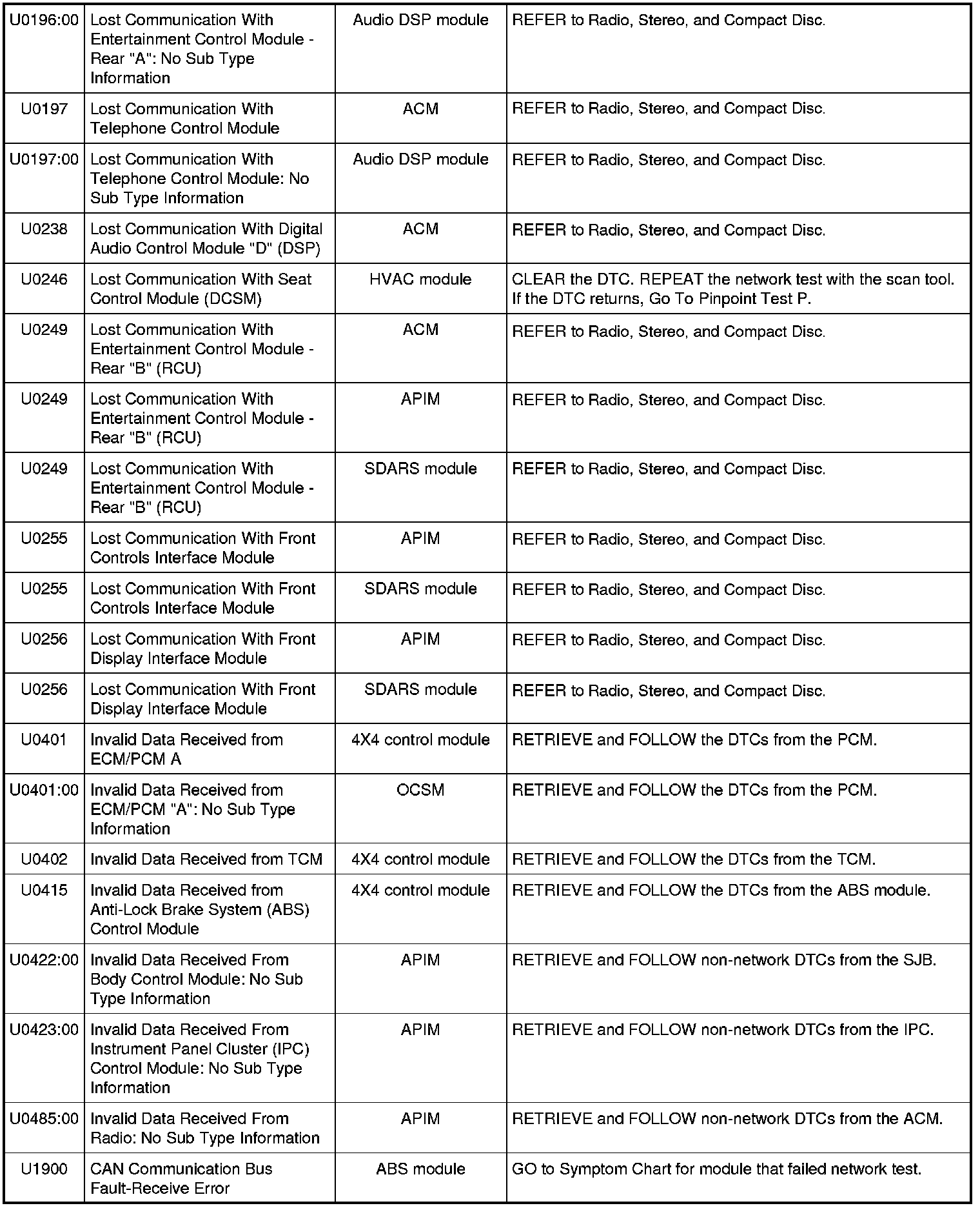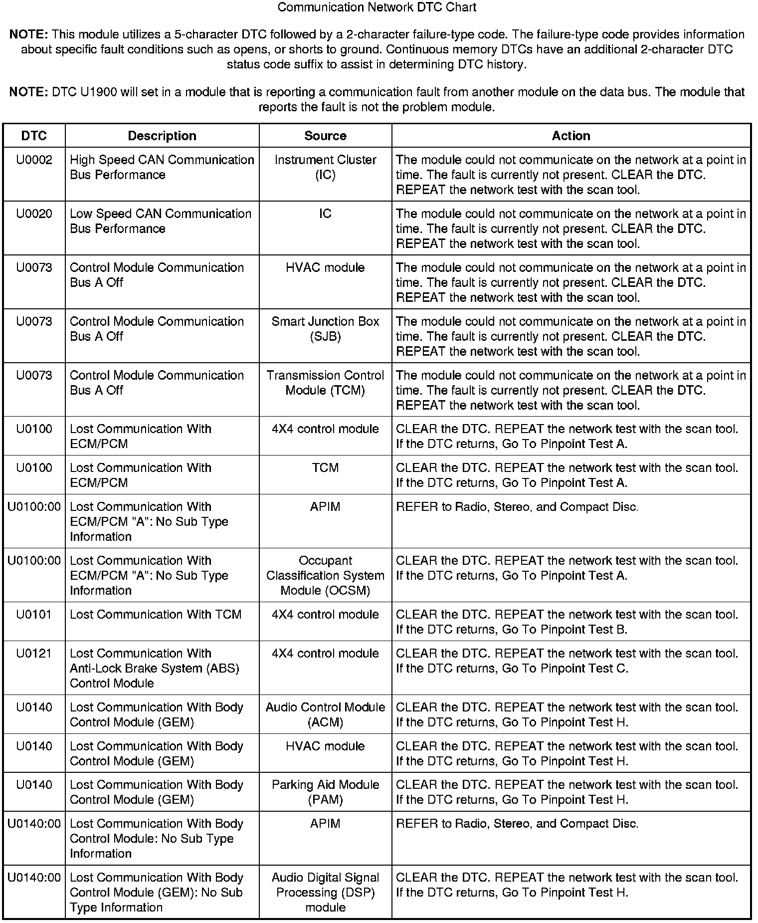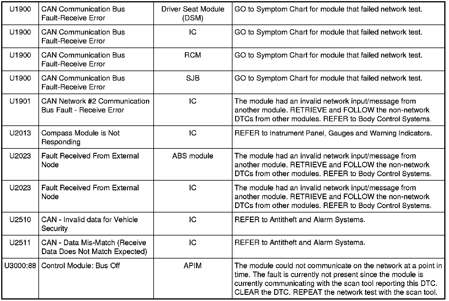 NOTE: Network DTCs (U-codes) are often a result of intermittent concerns such as damaged wiring or low battery voltage occurrences. Additionally, vehicle service procedures such as module reprogramming will often set network DTCs. Replacing a module to resolve a network DTC is unlikely to resolve the concern. To prevent repeat network DTC concerns, inspect all network wiring, especially connectors. Test the vehicle battery, refer to Battery.