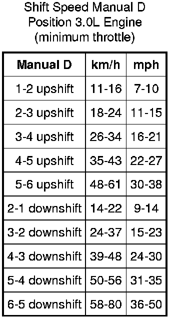 Shift Speed Manual D Position 3.0L Engine (minimum throttle):