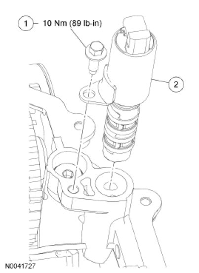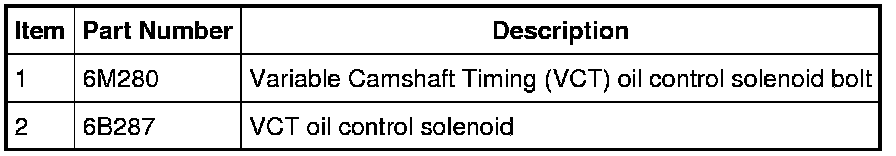2. Remove the bolt and the Variable Camshaft Timing (VCT) oil control solenoid.