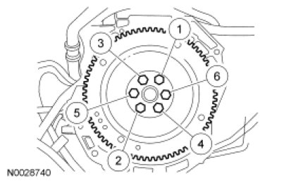 Install the flexplate and the 6 bolts. Tighten the 6 bolts in the sequence shown in 3 stages: