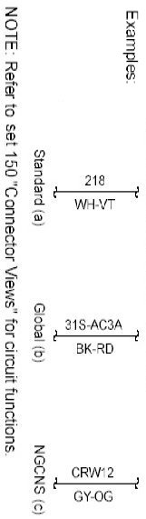 Connector Views show the views of the pins and/or cavities of all connectors. The pin and cavity sides are shown separately as if the connector were disconnected. The color of the connector housing is indicated next to the connector number when available. The harness causal number is located above the connector view and below the connector number. The circuit function charts are located below each connector. The wiring harness designations are listed in Component Location Charts.