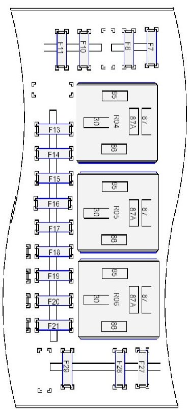 Fuse/Locations and Relay/Locations contains a view of the fuse/relay box, in which all fuses and relays are identified, numbered and named. Fuse and relay numbering and naming follow the indication of the fuse panel cover. In addition, for all removable relays, pin positions are added to illustrate proper orientation.