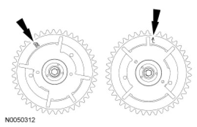NOTE: The RH and LH camshaft phaser sprockets are similar. Refer to the single timing mark to identify the RH camshaft phaser sprocket and the L timing mark to identify the LH camshaft phaser sprocket.