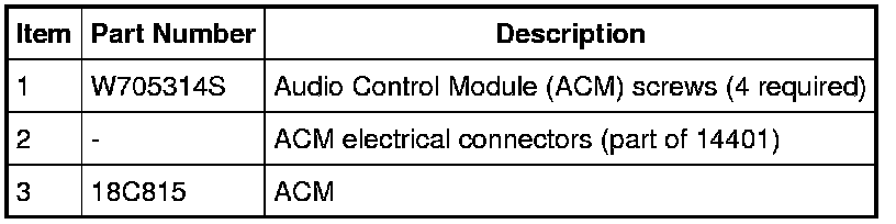NOTE: It is not necessary to remove the Audio Control Module (ACM) to retrieve the part number. For additional information, refer to Audio Unit Part Number Retrieval Audio Unit Part Number Retrieval.