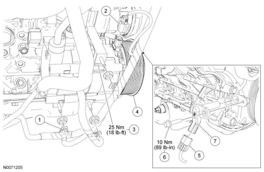 4. Disconnect the A/C compressor field coil and the Crankshaft Position (CKP) sensor electrical connectors.