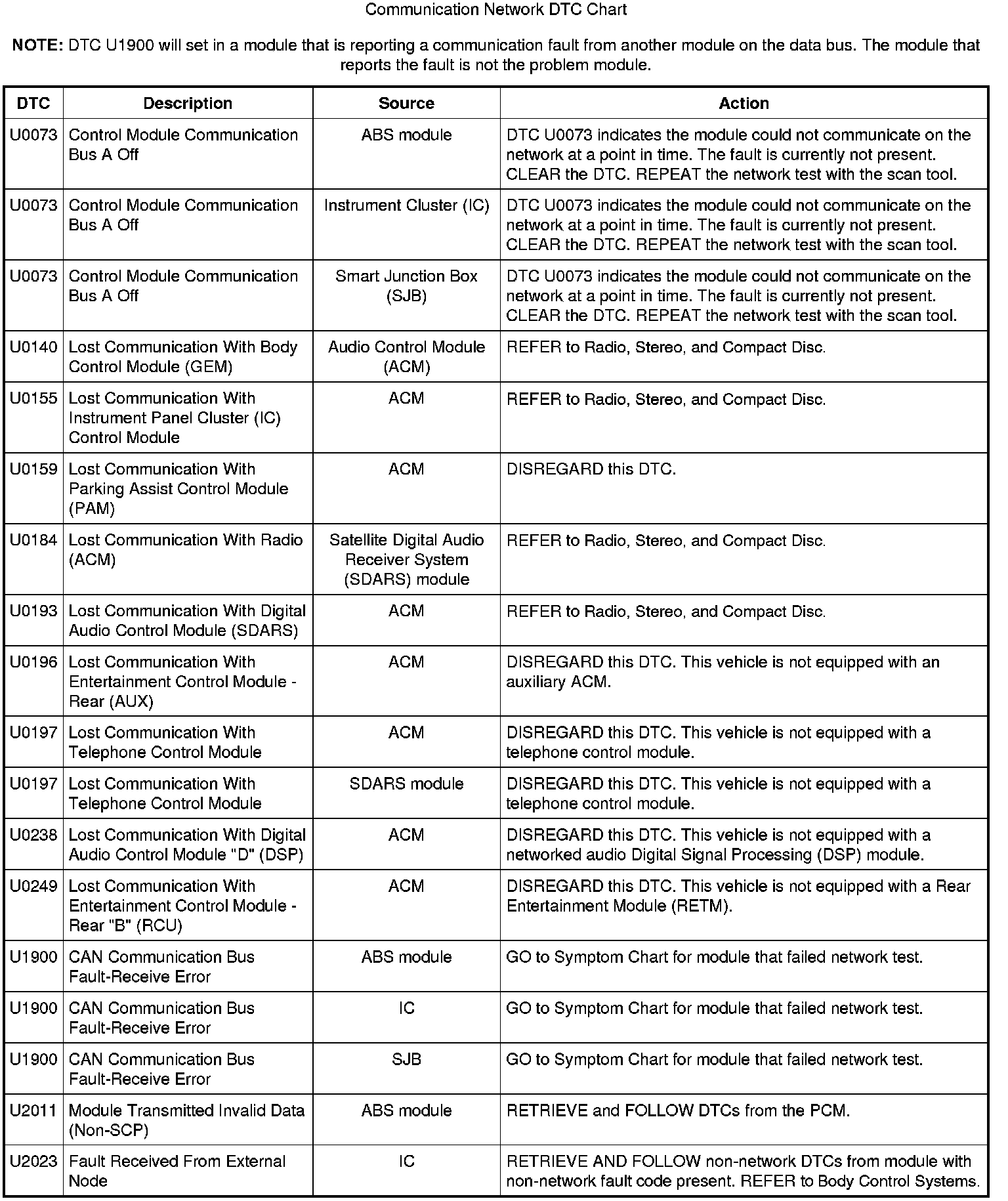 NOTE: Network DTCs (U-codes) are often a result of intermittent concerns such as faulty wiring or low battery voltage occurrences. Additionally, vehicle service procedures such as module reprogramming will often set network DTCs. Replacing a module to resolve a network DTC is unlikely to resolve the concern. To prevent repeat network DTC concerns, inspect all network wiring, especially connectors. Test the vehicle battery, refer to Battery.