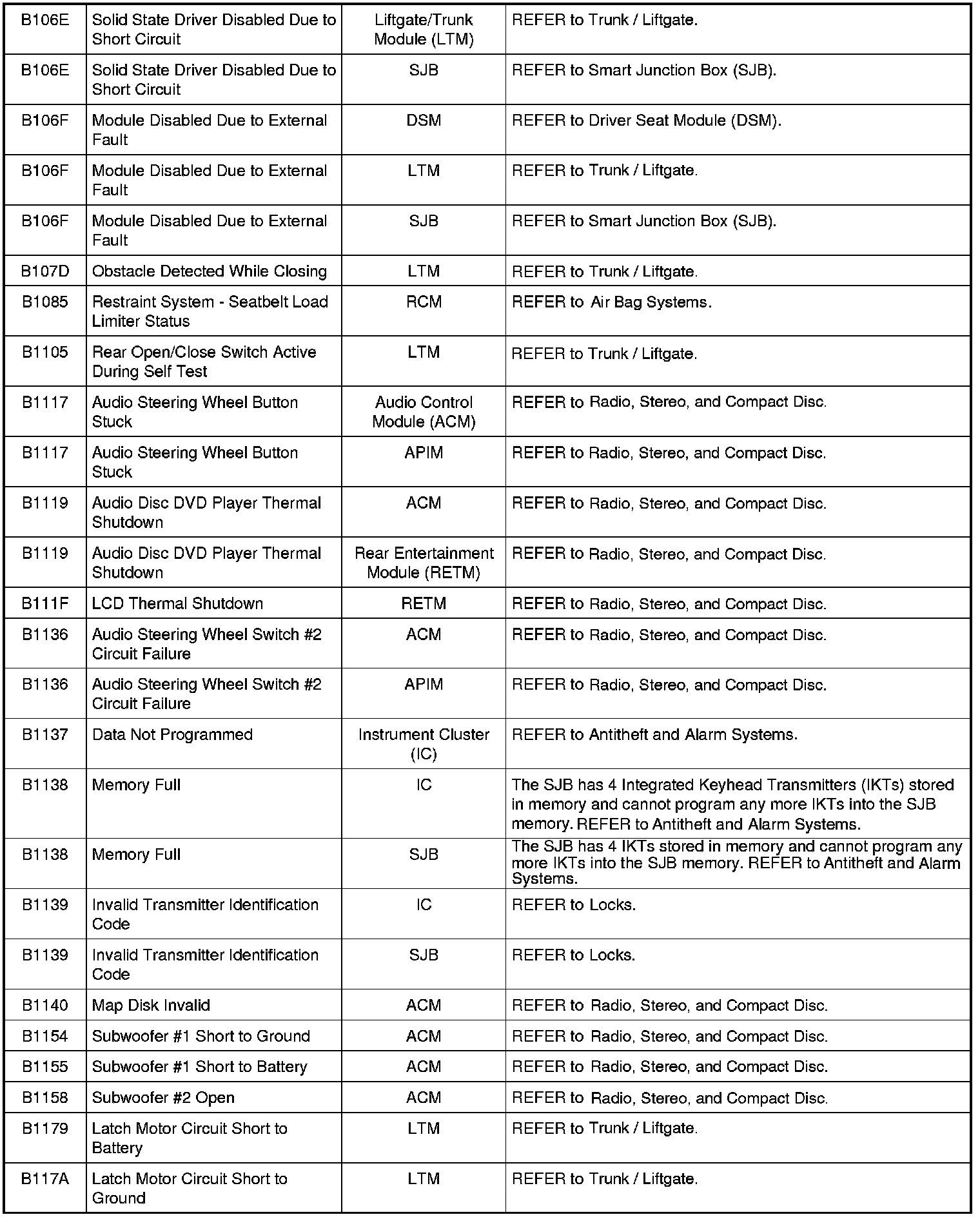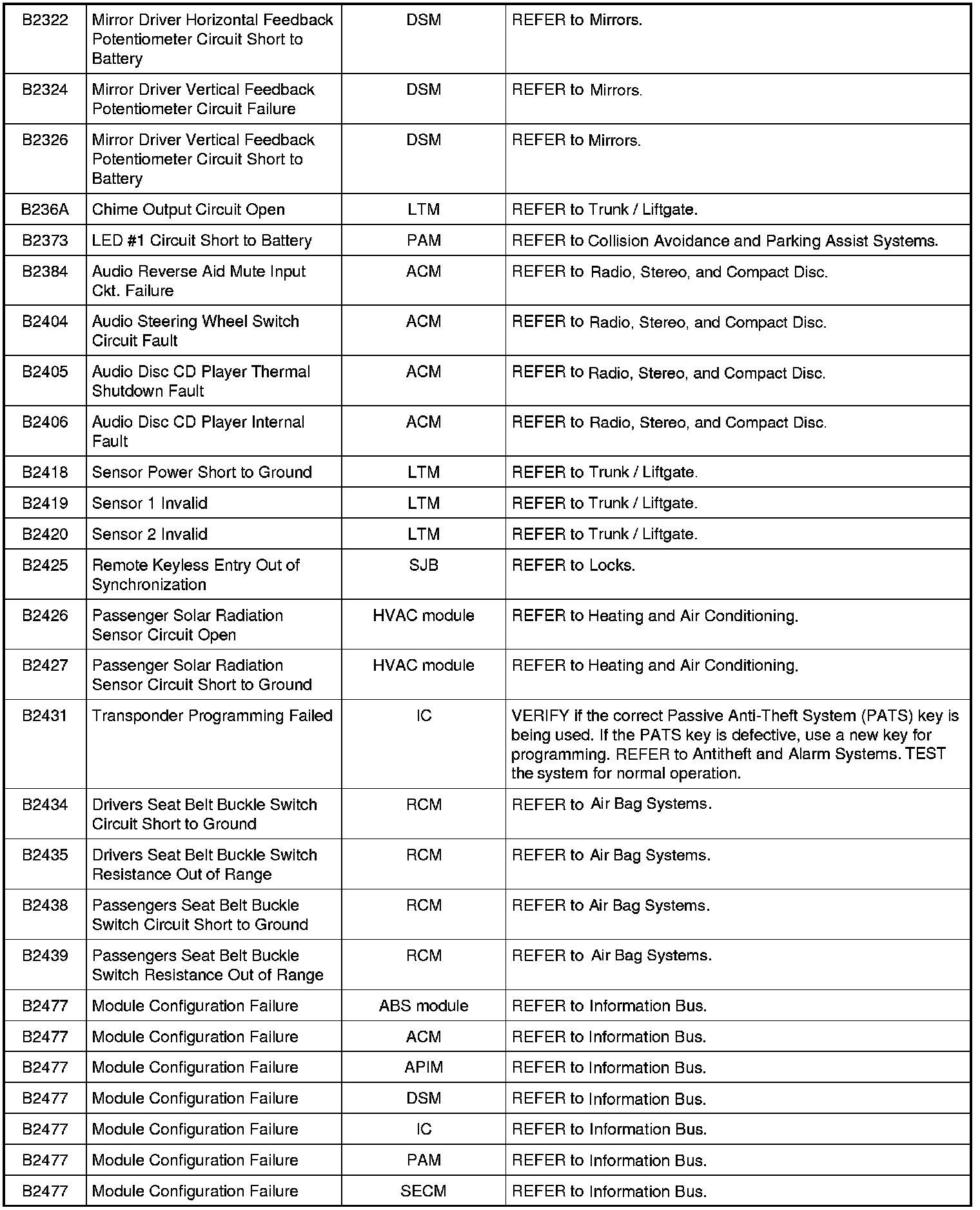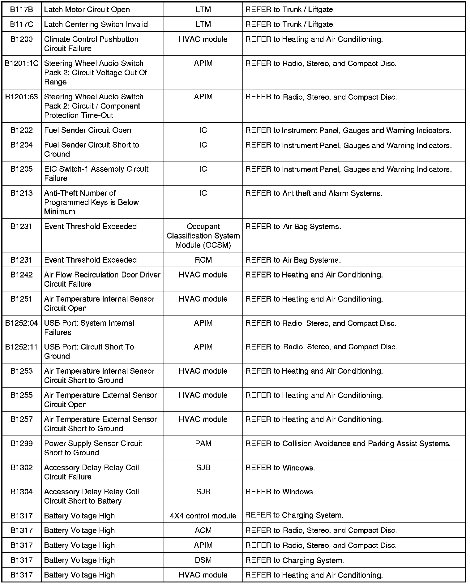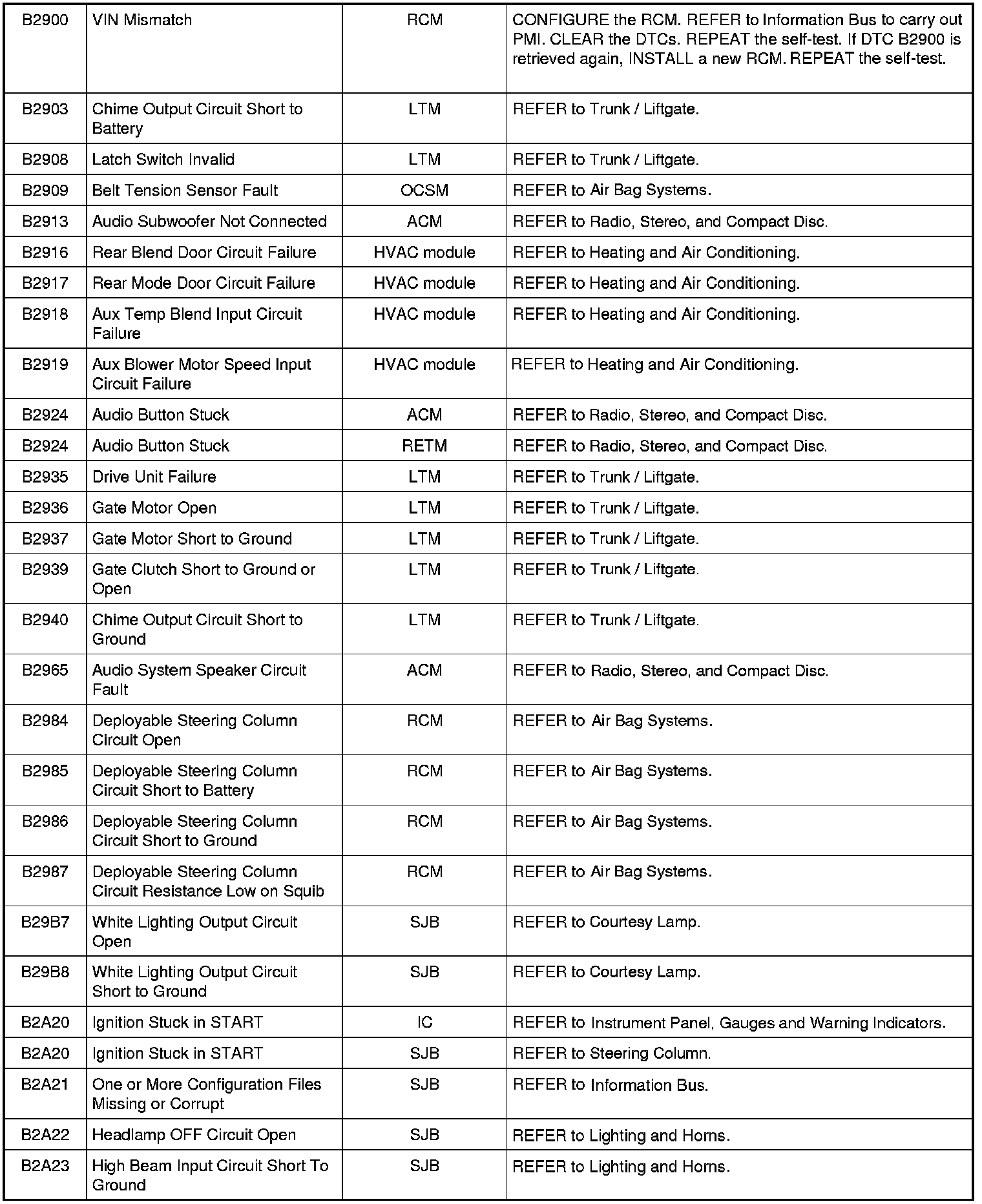 Home >> Ford >> 2009 >> Taurus AWD V6-3.5L >> Repair and Diagnosis >> Body and Frame >> Body Control Systems >> Testing and Inspection >> Diagnostic Trouble Code Descriptions >> Diagnostic Trouble Code (DTC) Chart