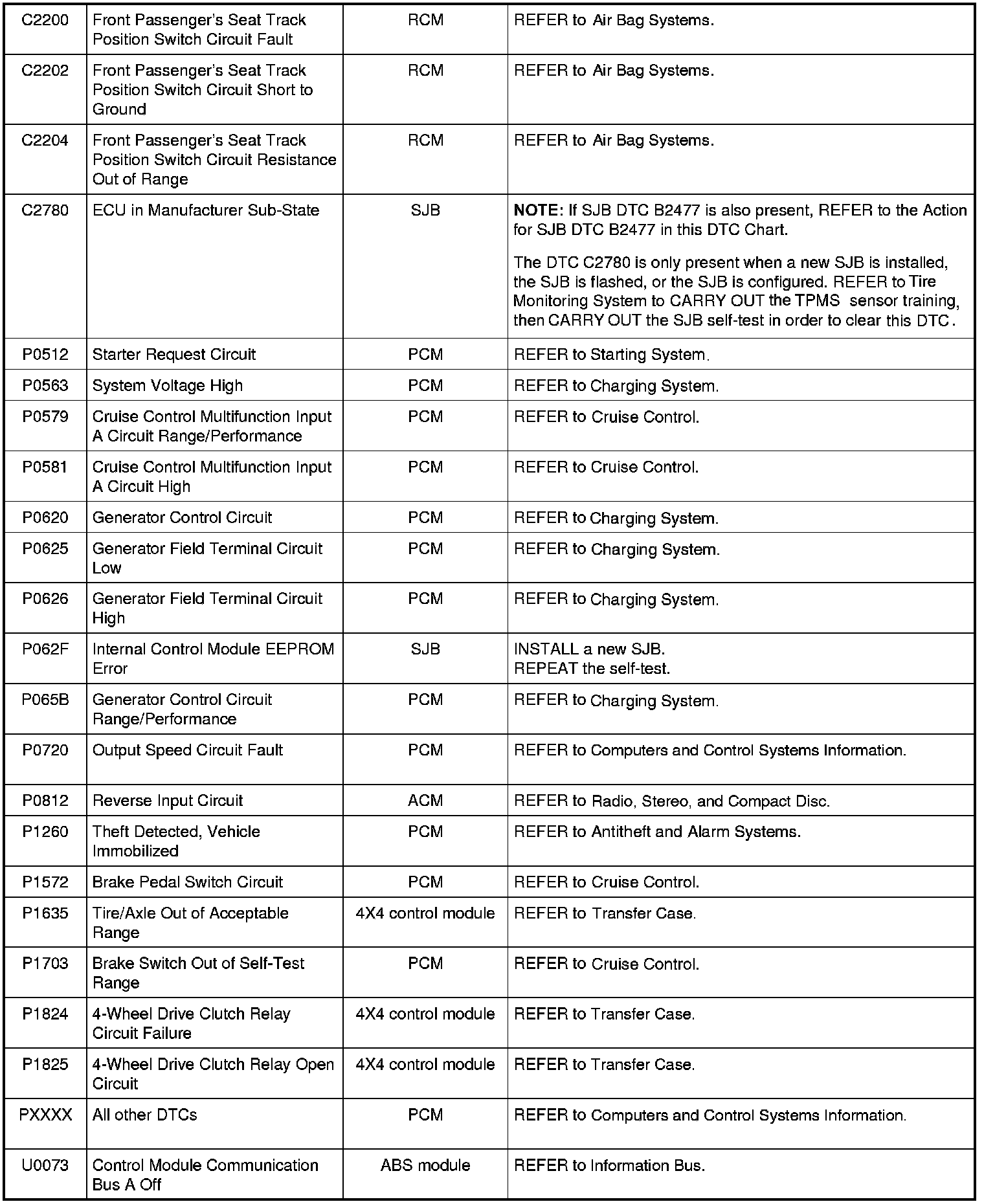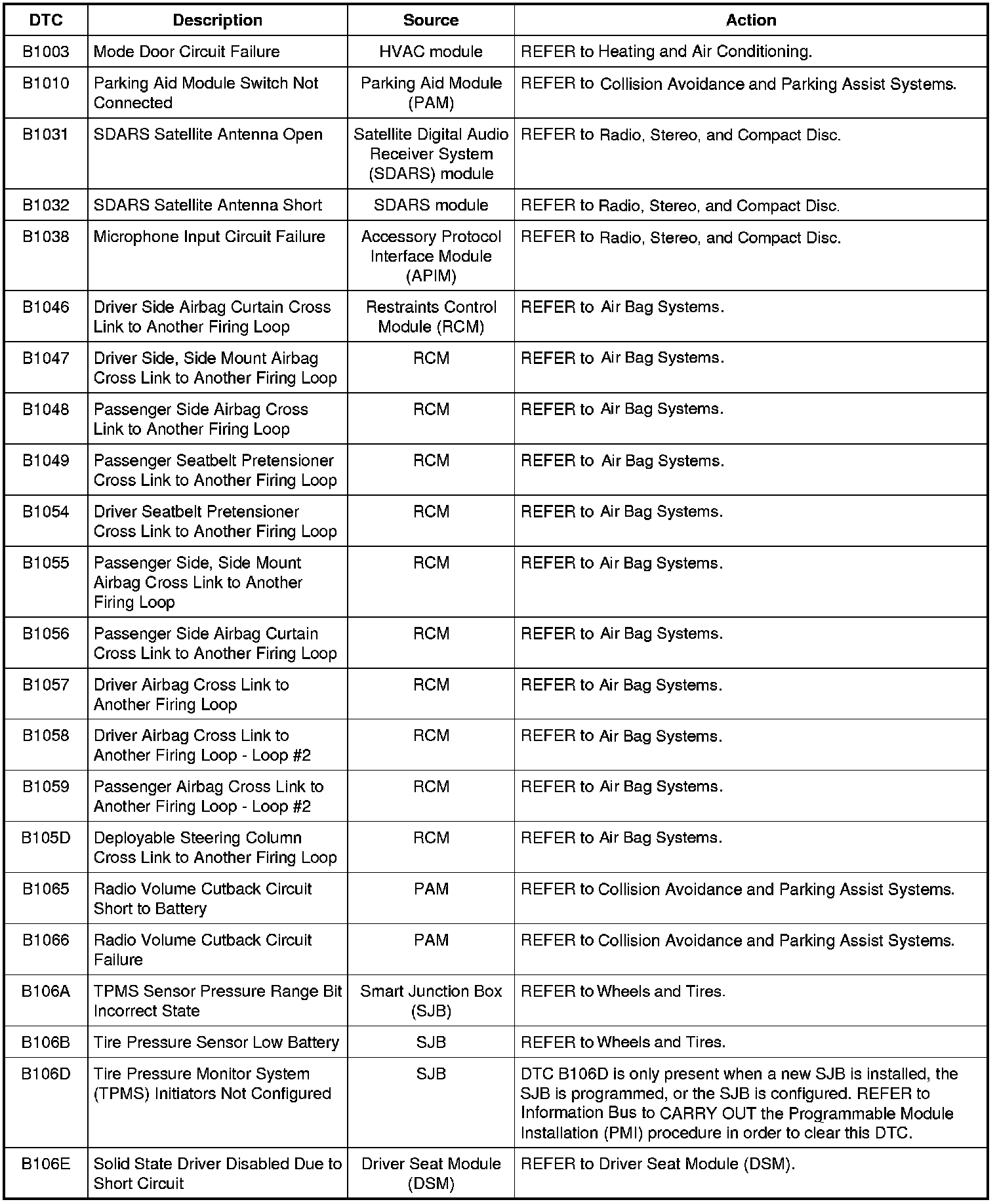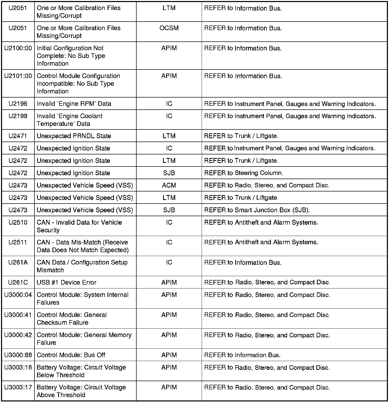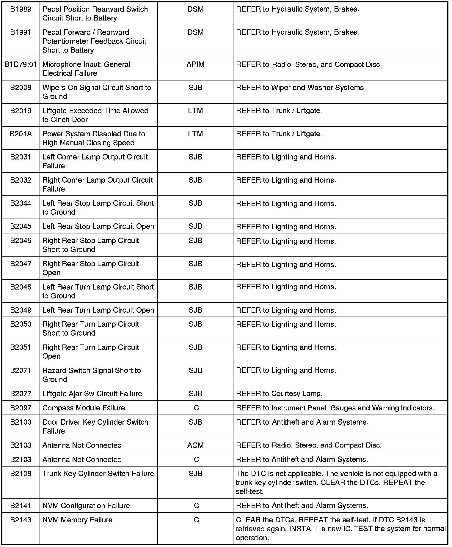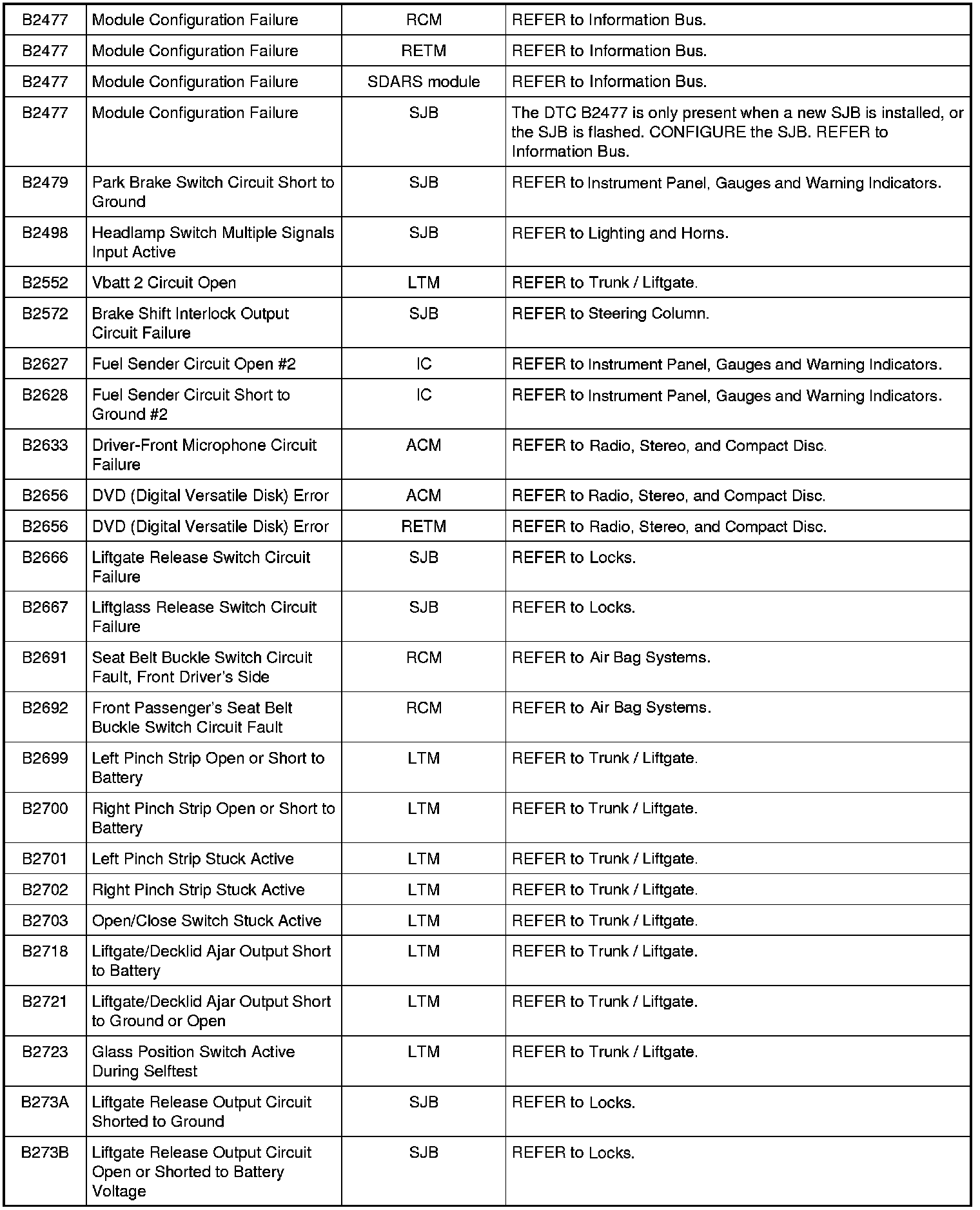 Home >> Ford >> 2009 >> Taurus AWD V6-3.5L >> Repair and Diagnosis >> Body and Frame >> Body Control Systems >> Testing and Inspection >> Diagnostic Trouble Code Descriptions >> Diagnostic Trouble Code (DTC) Chart