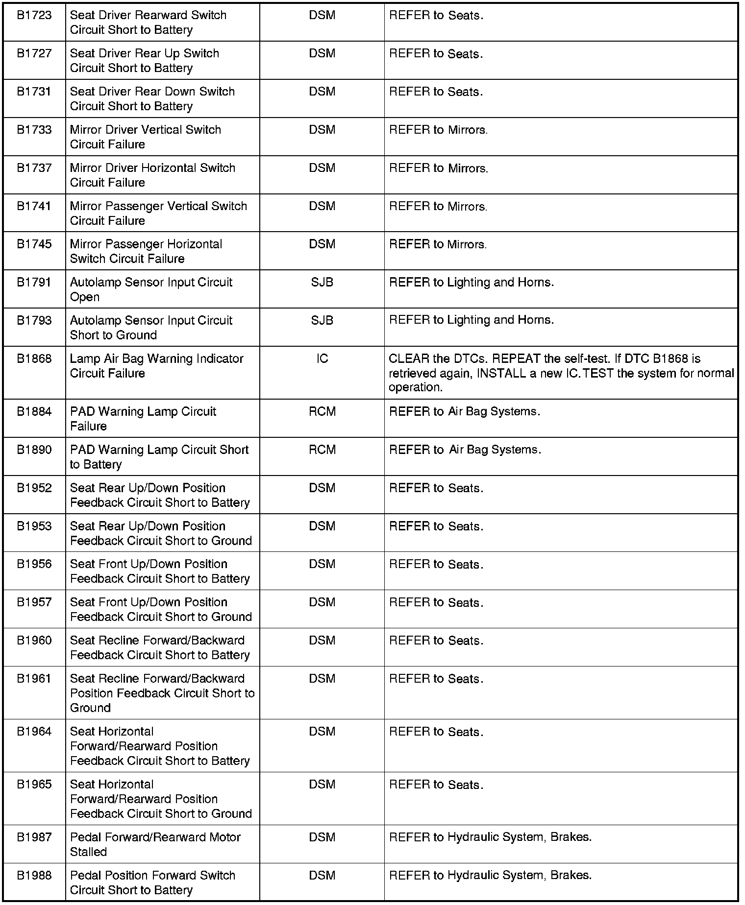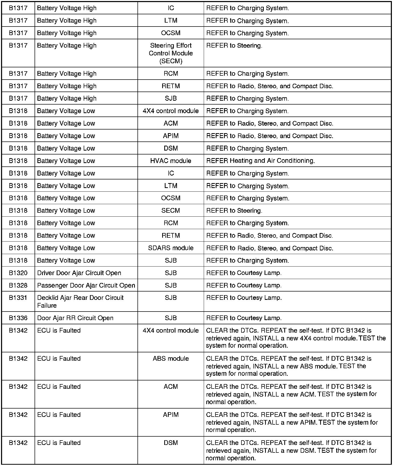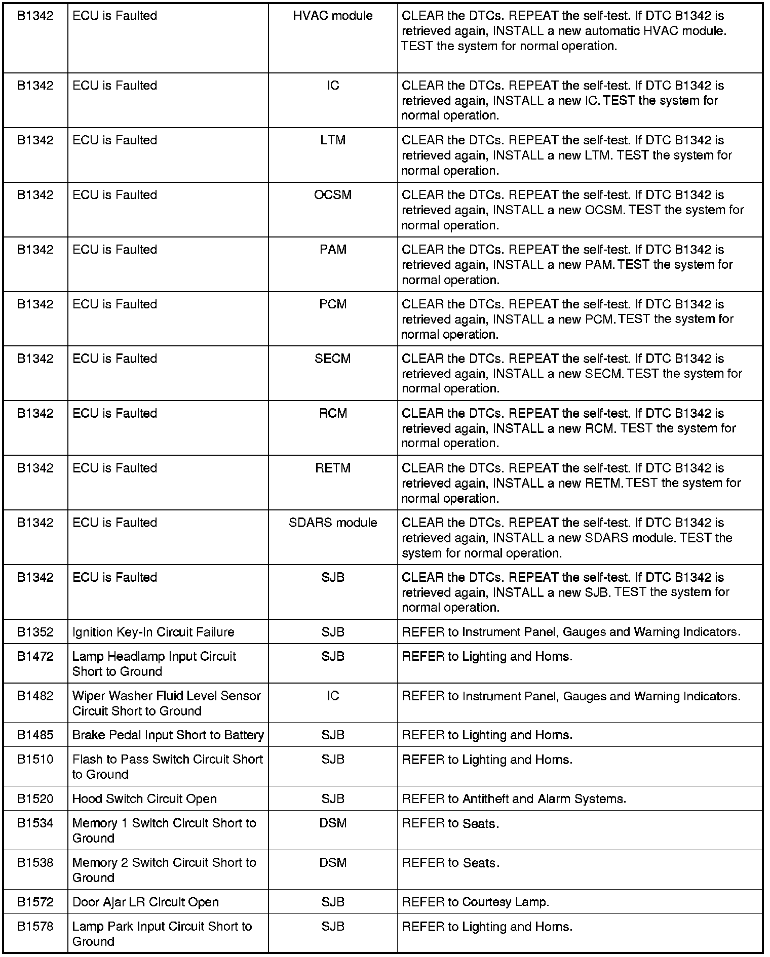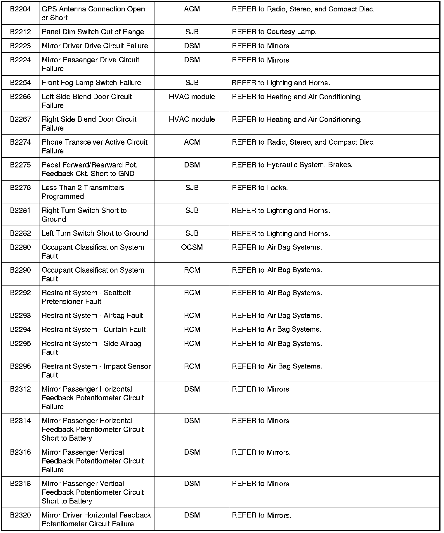 Home >> Ford >> 2009 >> Taurus AWD V6-3.5L >> Repair and Diagnosis >> Body and Frame >> Body Control Systems >> Testing and Inspection >> Diagnostic Trouble Code Descriptions >> Diagnostic Trouble Code (DTC) Chart
