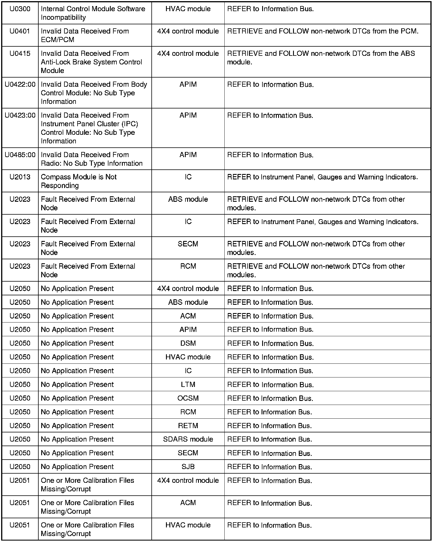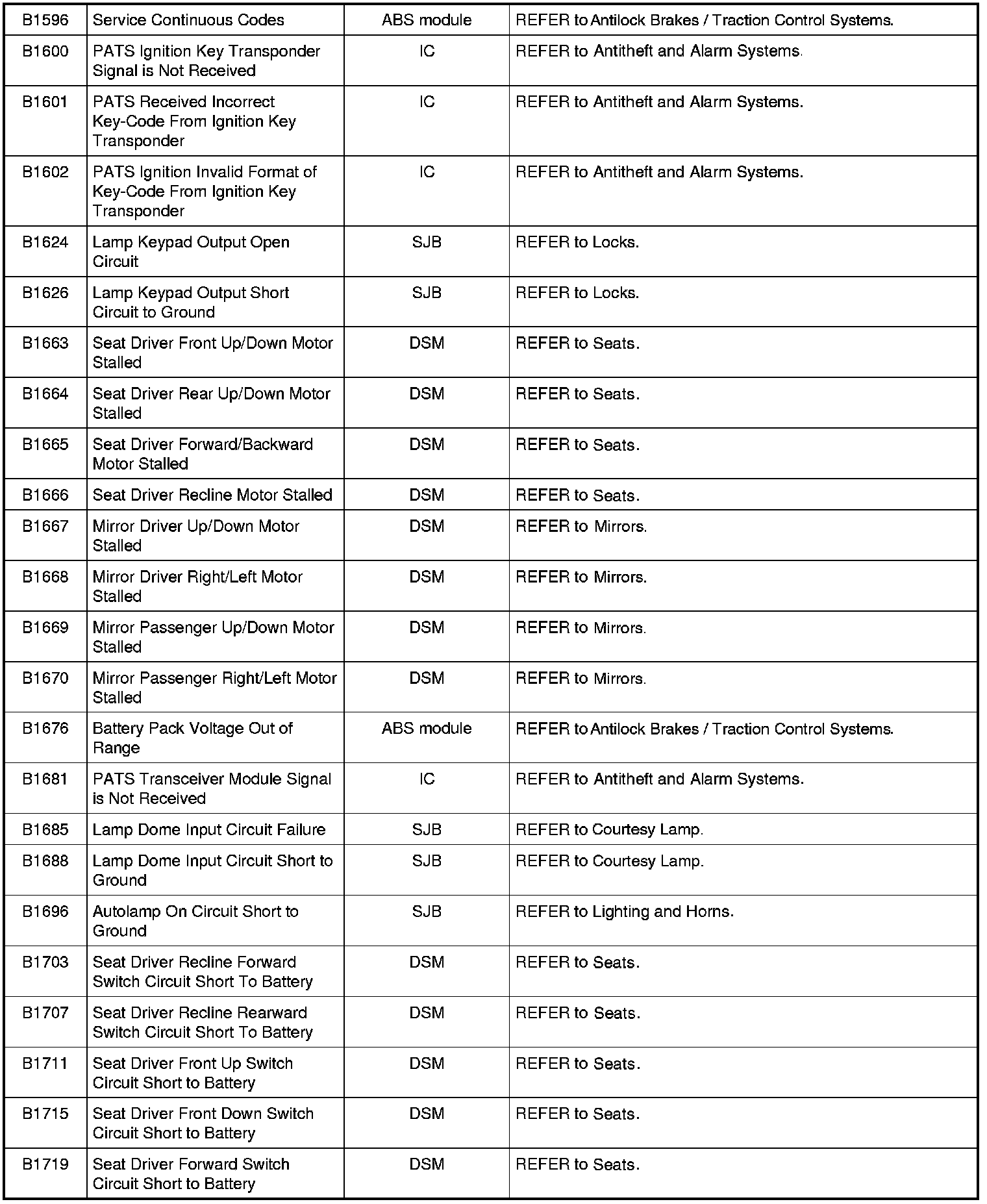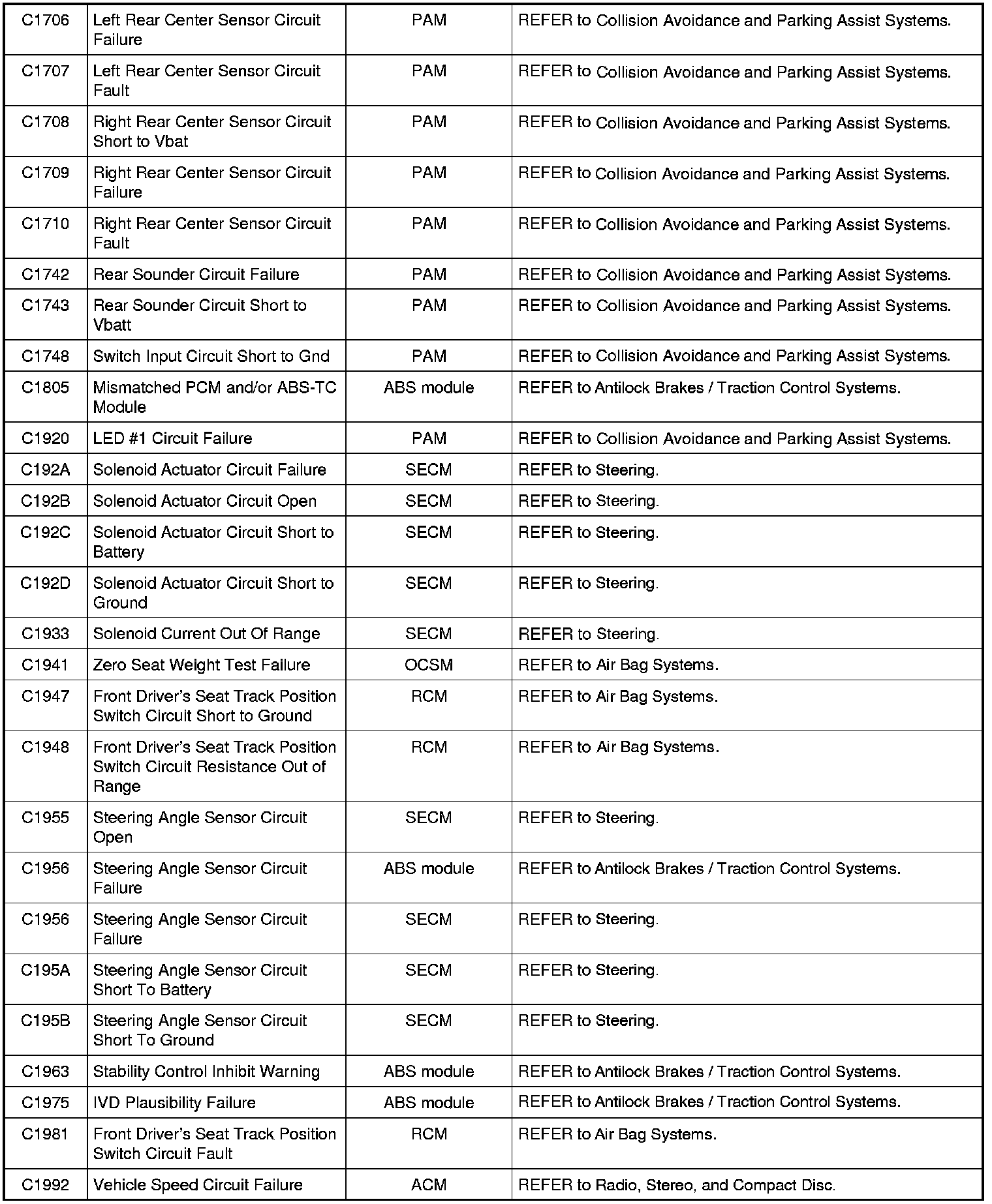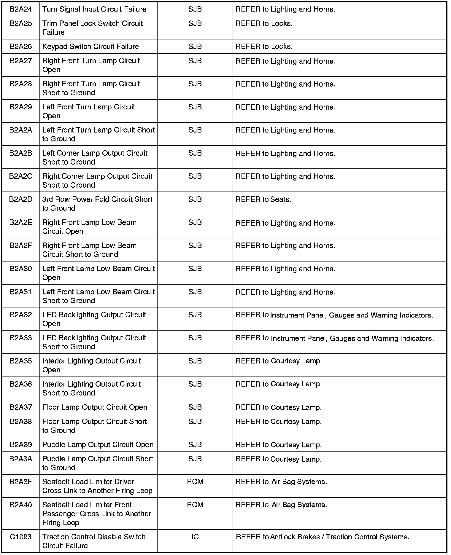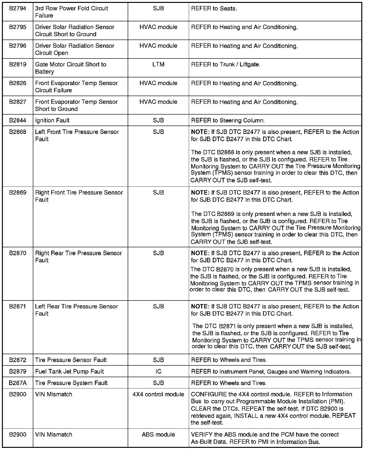 Home >> Ford >> 2009 >> Taurus AWD V6-3.5L >> Repair and Diagnosis >> Body and Frame >> Body Control Systems >> Testing and Inspection >> Diagnostic Trouble Code Descriptions >> Diagnostic Trouble Code (DTC) Chart