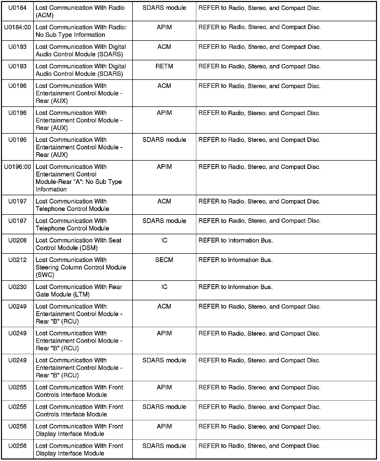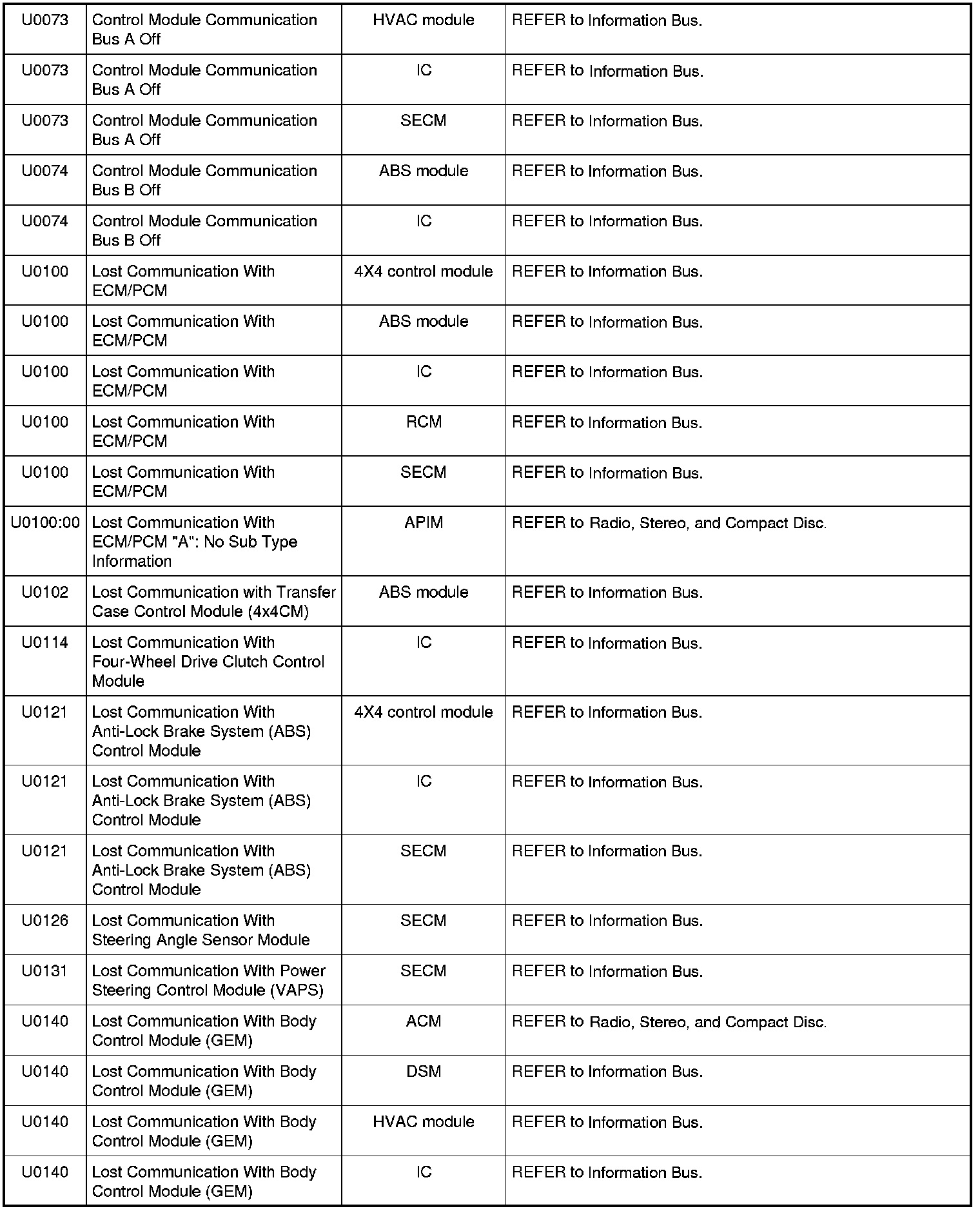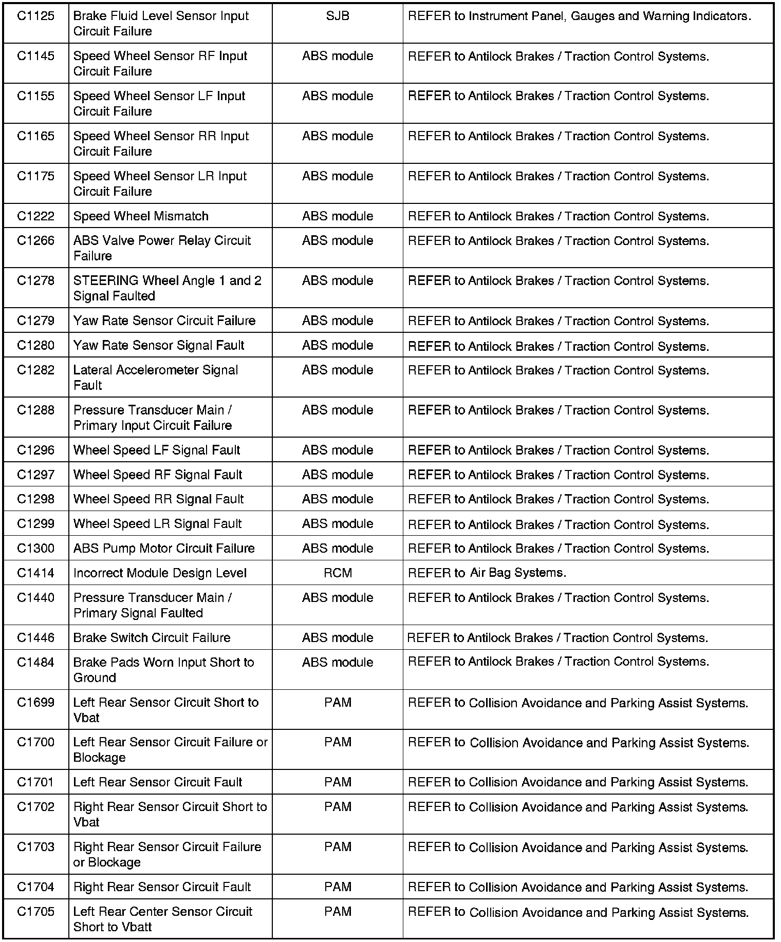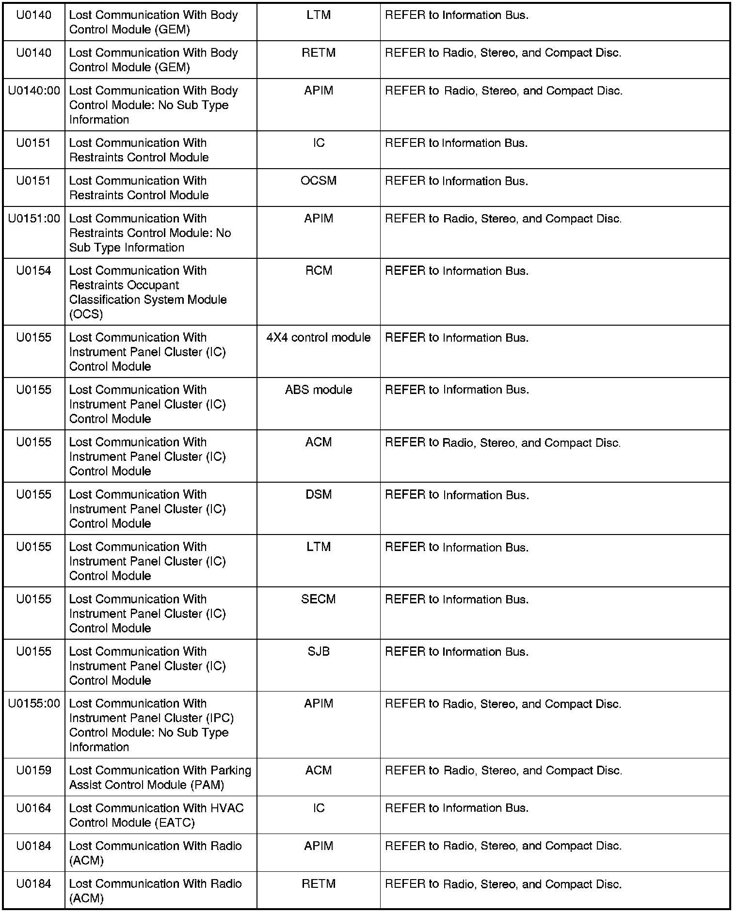 Home >> Ford >> 2009 >> Taurus AWD V6-3.5L >> Repair and Diagnosis >> Body and Frame >> Body Control Systems >> Testing and Inspection >> Diagnostic Trouble Code Descriptions >> Diagnostic Trouble Code (DTC) Chart