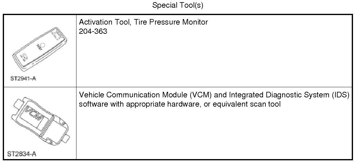 NOTE: If the vehicle has been stationary for more than 30 minutes, the sensors will go into a "sleep mode" to conserve battery power. It will be necessary to wake them up so they will transmit the latest tire pressure information to the Smart Junction Box (SJB). For additional information, refer to Tire Pressure Monitoring System (TPMS) Sensor Activation Programming and Relearning.