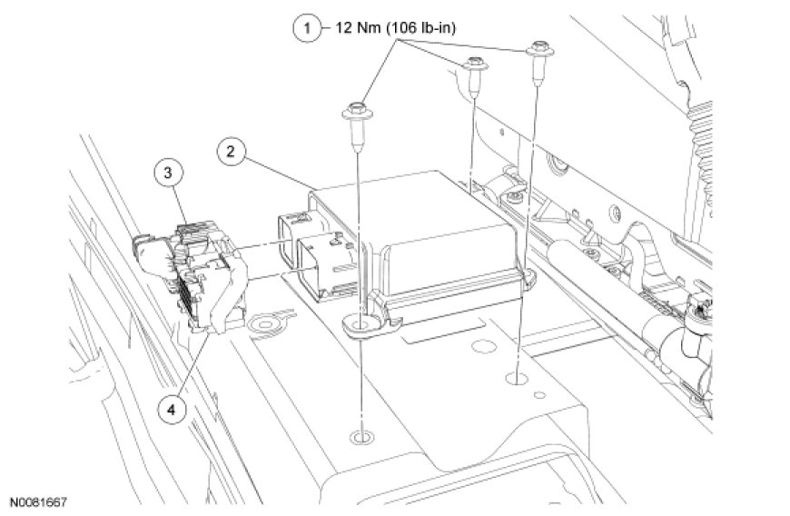 2. WARNING: Always tighten the fasteners of the restraints control module (RCM) and impact sensor (if equipped) to the specified torque. Failure to do so may result in incorrect restraint system operation, which increases the risk of personal injury or death in a crash.