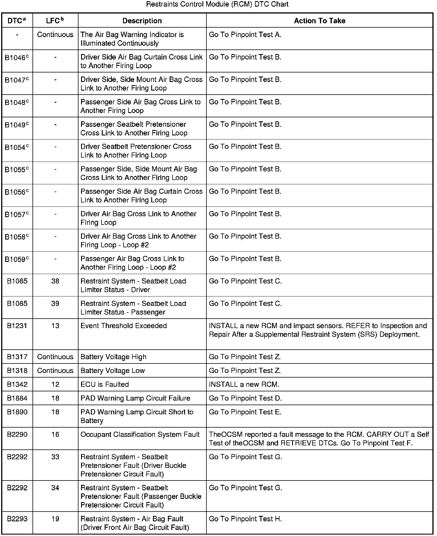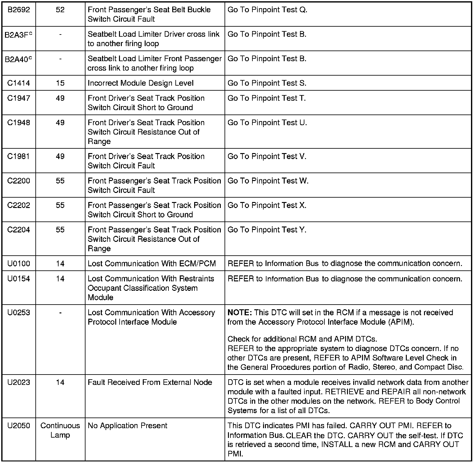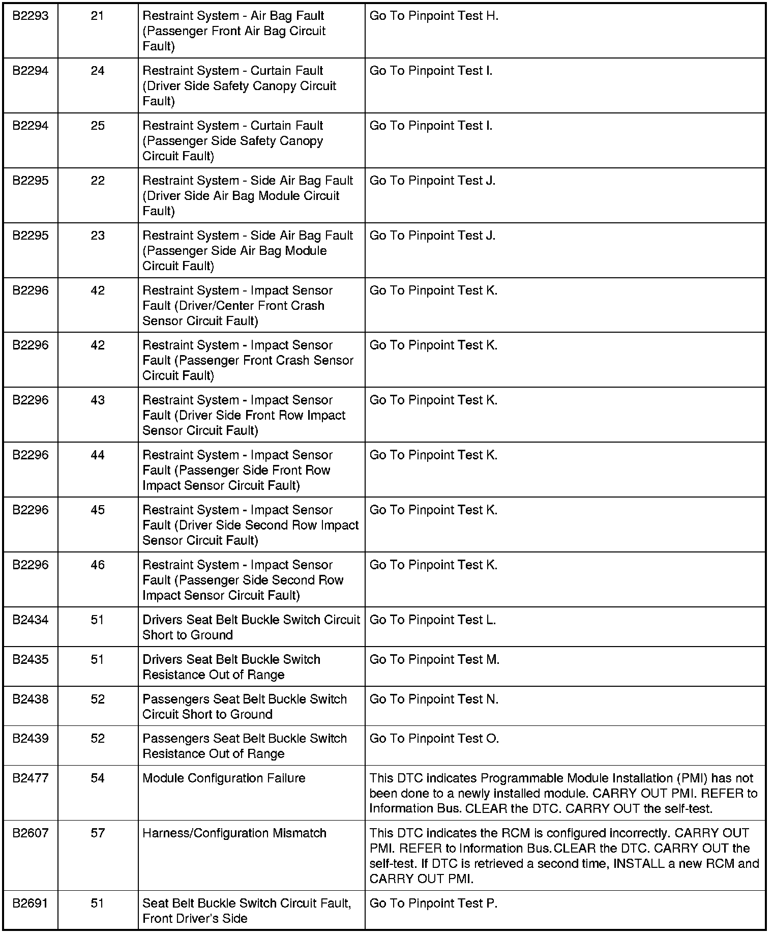 Home >> Ford >> 2009 >> Taurus AWD V6-3.5L >> Repair and Diagnosis >> Restraints and Safety Systems >> Air Bag Systems >> Testing and Inspection >> Diagnostic Trouble Code Tests and Associated Procedures >> Restraints Control Module (RCM)