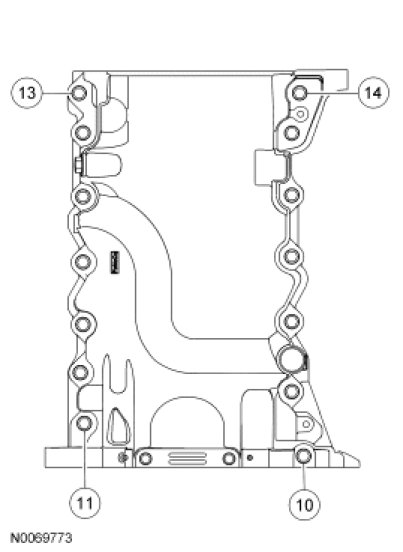 Install the oil pan and bolts 10, 11, 13 and 14.Tighten in the sequence shown to 3 Nm (27 lb-in).