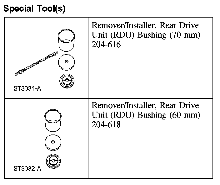 - When installing the RDU bushing, the Rear Drive Unit (RDU) Bushing Remover/Installers will fall away as the RDU bushing is installed into the subframe. The Rear Drive Unit (RDU) Bushing Remover/Installers do not control the depth of the bushing. The RDU bushing is fully seated when the Rear Drive Unit (RDU) Bushing Remover/Installer falls away from the subframe. Do not continue to tighten the Rear Drive Unit (RDU) Bushing Remover/Installer.