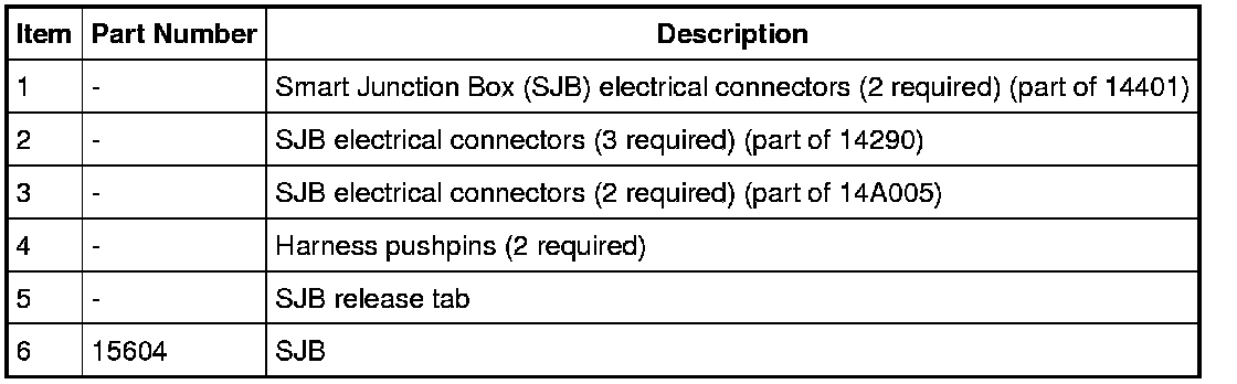 NOTE: The steps included in the SJB removal and installation procedure are critical to restoring the vehicle security and the TPMS to normal operation. A new SJB is delivered in a manufacturing mode with 7 pre-set DTCs related to the TPMS. To clear the DTCs, successful configuration of the SJB must occur, followed by successful TPMS sensor training, and a successful self-test, including clearing of the DTCs.