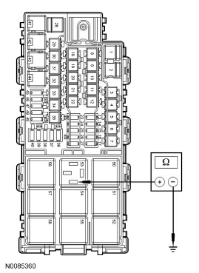 - Measure the resistance between rear window defrost relay socket pin 86, circuit CH122 (WH/OG), harness side and ground.