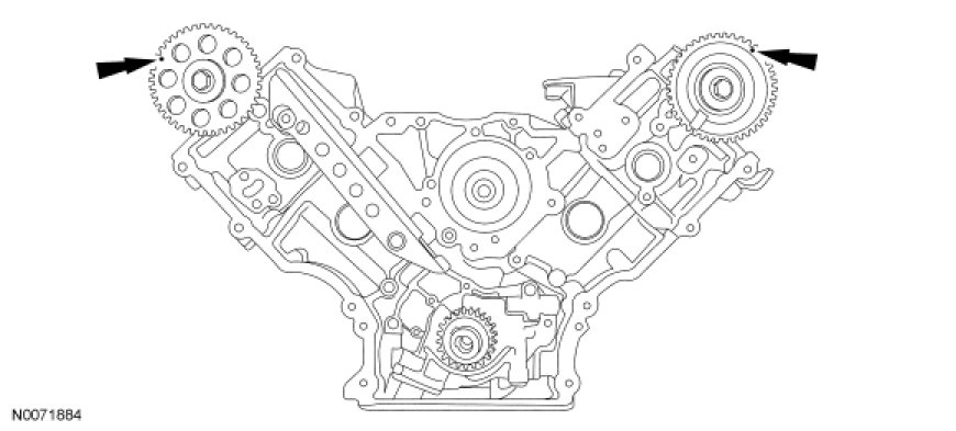 Rotate the RH camshaft sprocket until the timing mark is approximately at the 11 o'clock position. Rotate the LH camshaft sprocket until the timing mark is approximately at the 1 o'clock position.