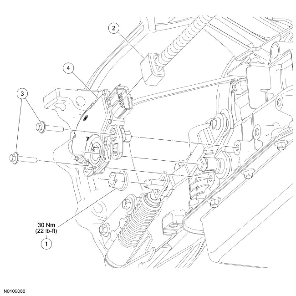 3. NOTICE: Tightening one screw before tightening the other may cause the Transmission Range (TR) sensor to bind or become damaged.