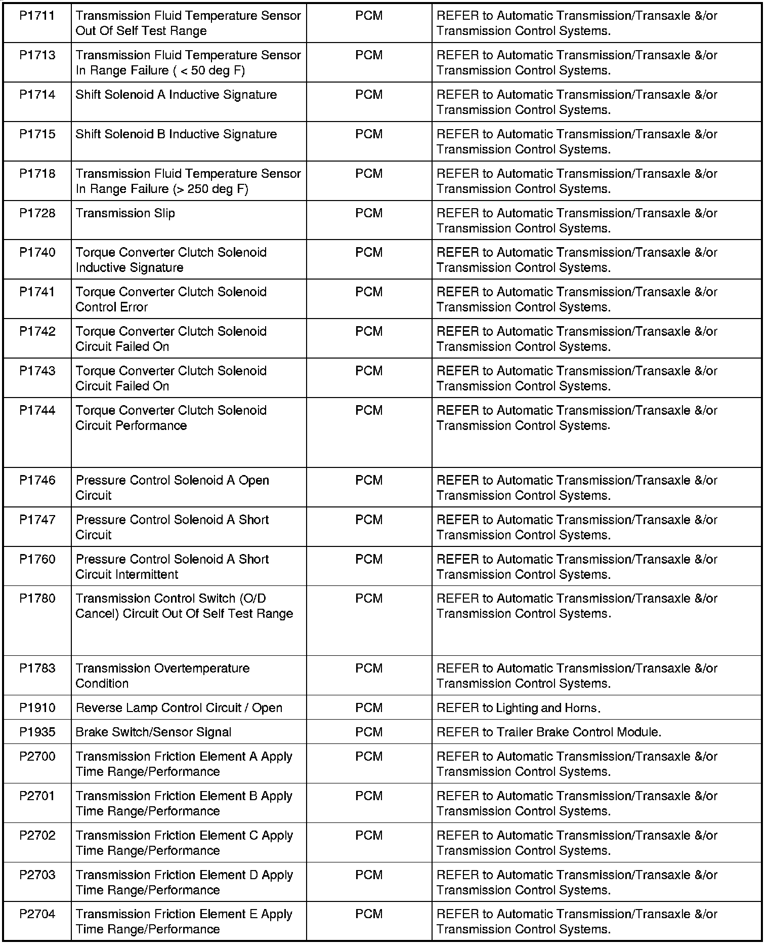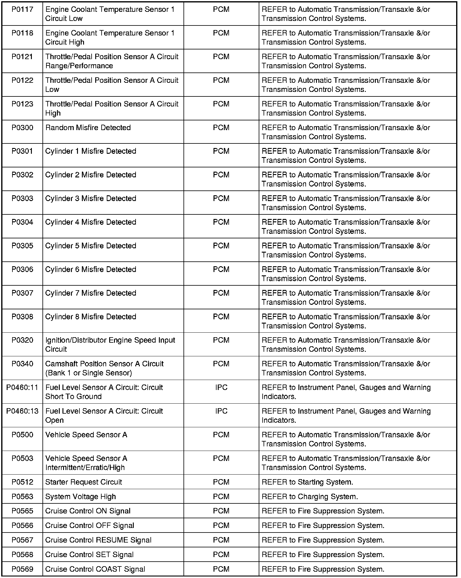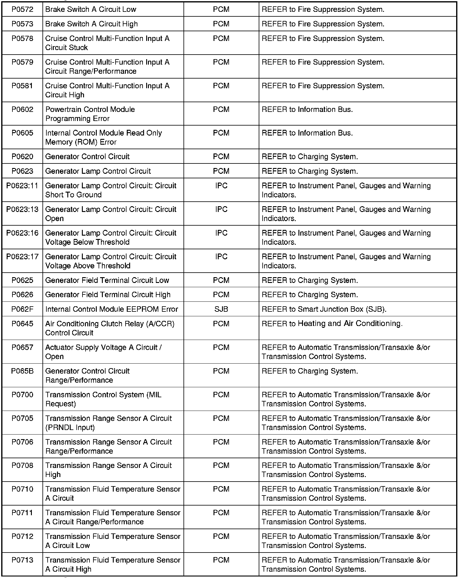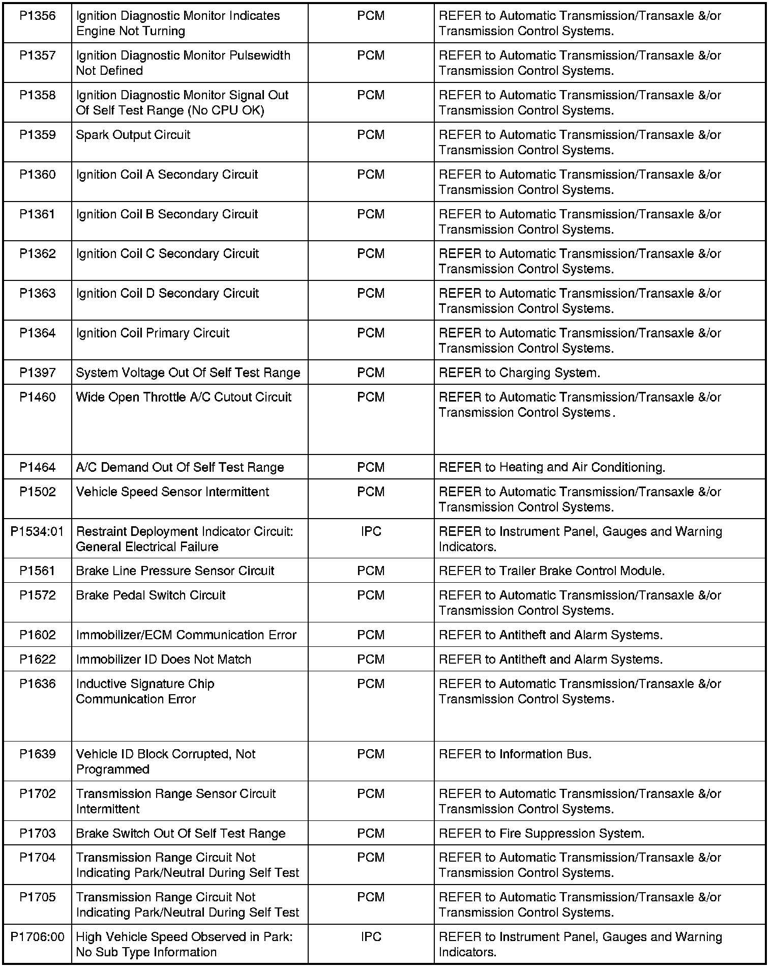 NOTE: Most powertrain (P-code) DTCs are diagnosed in Computers and Control Systems Information. If the P-code retrieved is not listed below, refer to Computers and Control Systems Information to continue diagnostics.