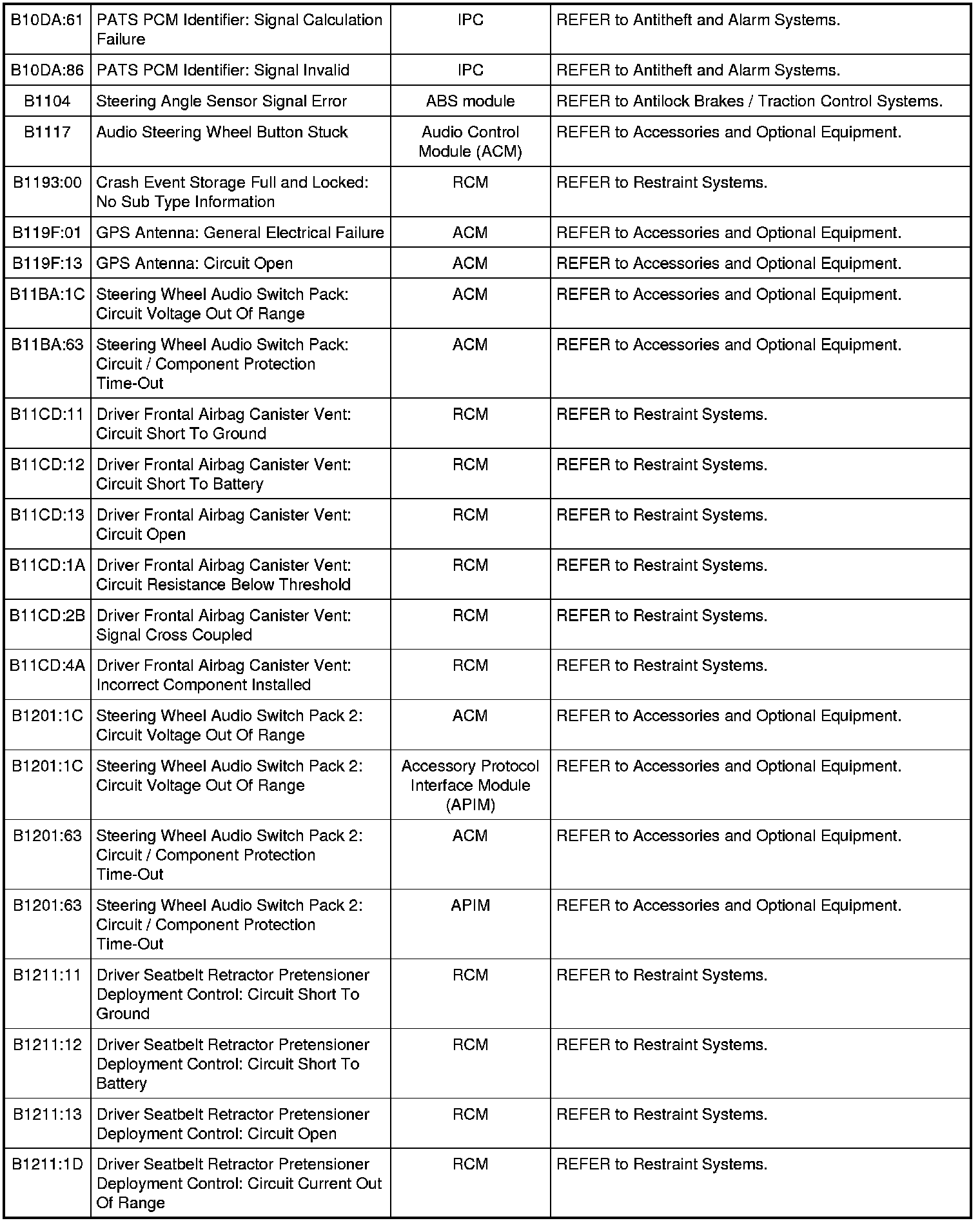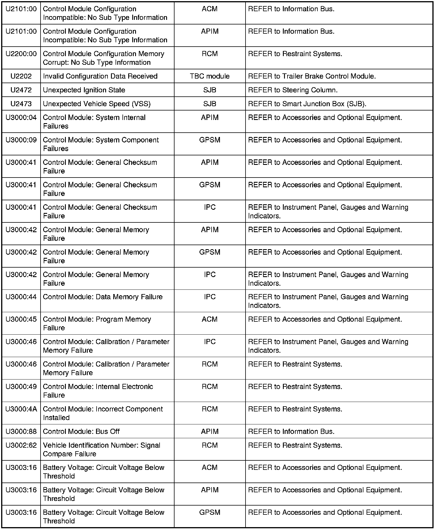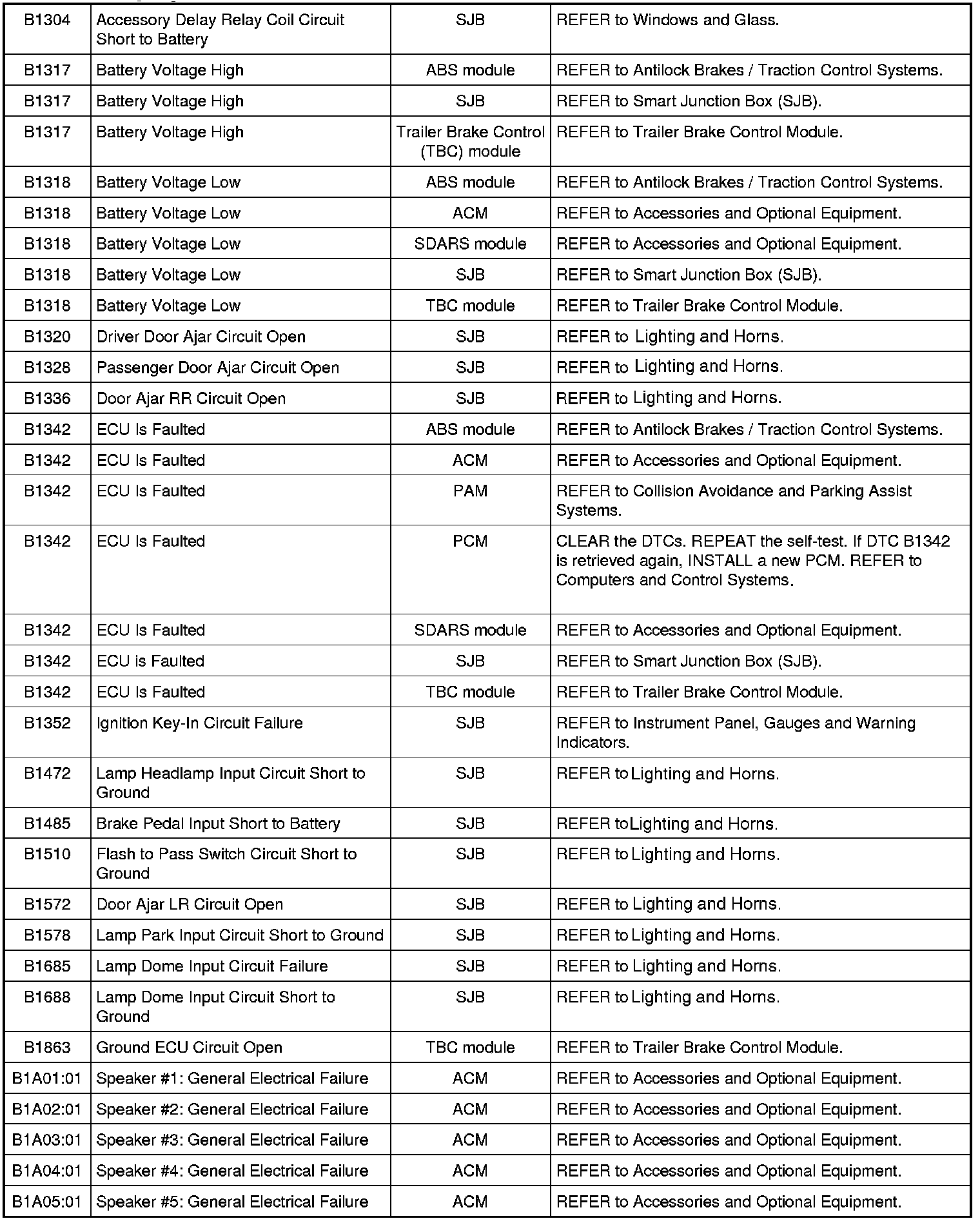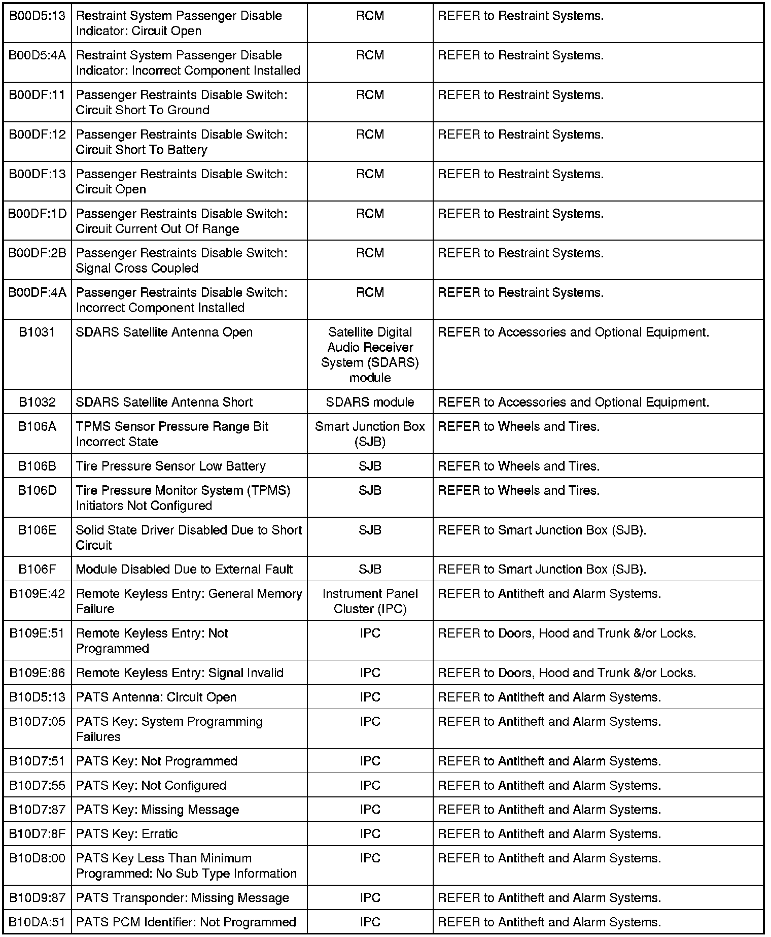 Home >> Ford >> 2010 >> E 150 V8-4.6L >> Repair and Diagnosis >> Body and Frame >> Body Control Systems >> Testing and Inspection >> Diagnostic Trouble Code Descriptions >> Diagnostic Trouble Code (DTC) Chart