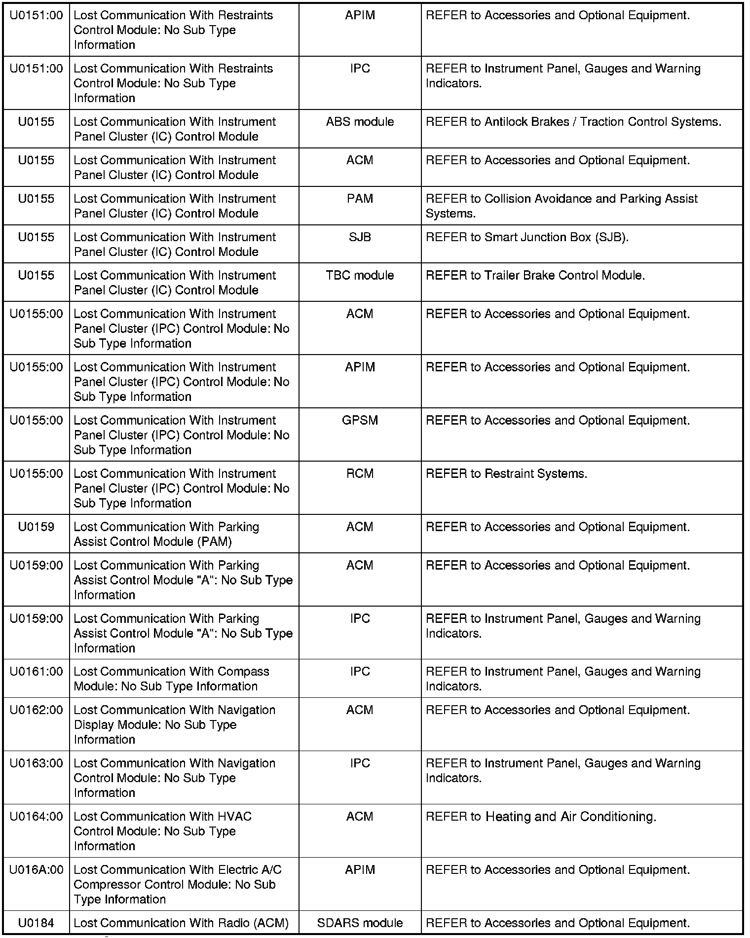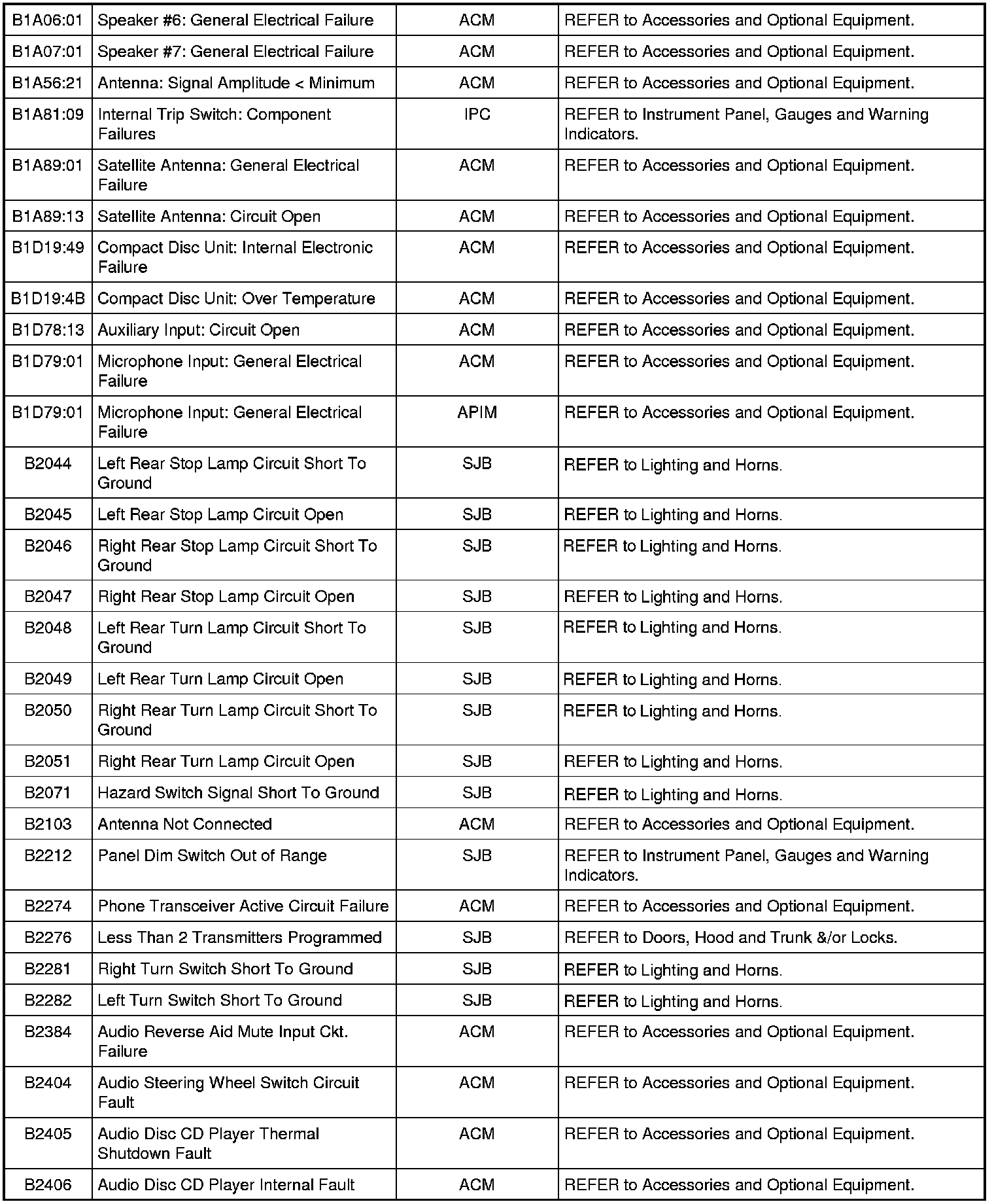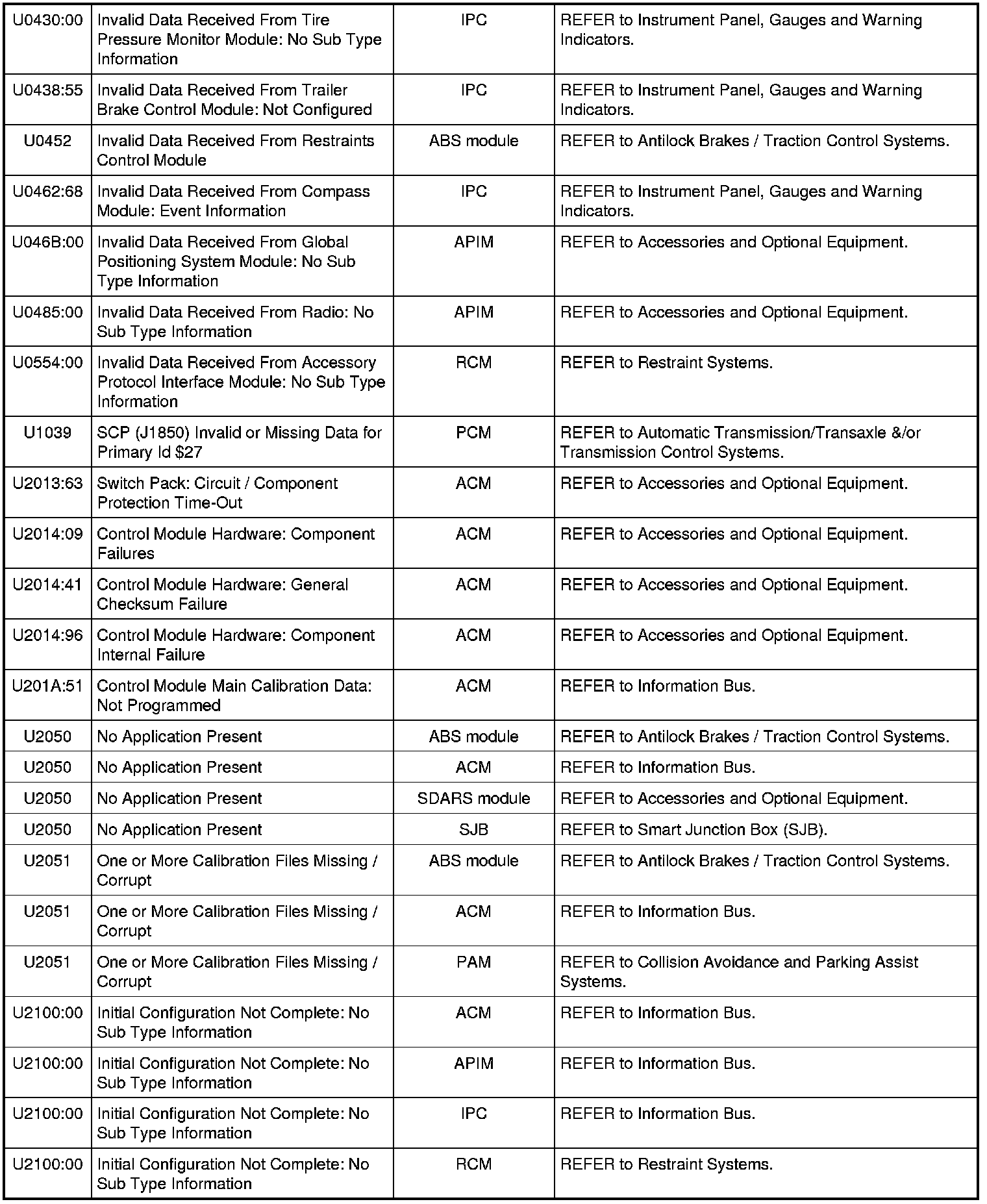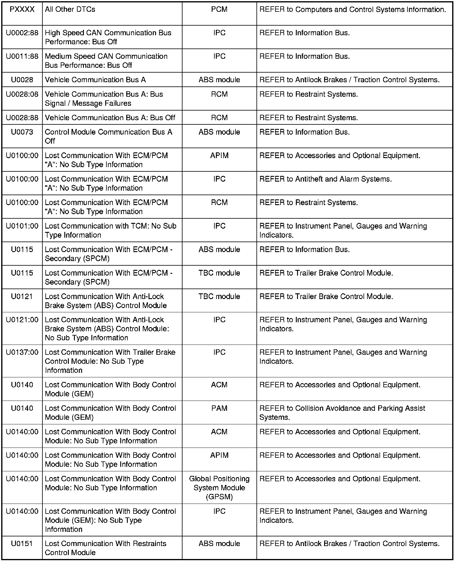 Home >> Ford >> 2010 >> E 150 V8-4.6L >> Repair and Diagnosis >> Body and Frame >> Body Control Systems >> Testing and Inspection >> Diagnostic Trouble Code Descriptions >> Diagnostic Trouble Code (DTC) Chart