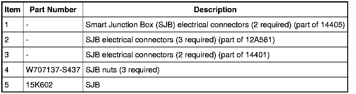 NOTE: Prior to the replacement of the module, it is necessary to upload the module configuration information to a scan tool. This information must be downloaded into the new Smart Junction Box (SJB) after installation. For additional information, refer to Information Bus. In the event that As-Built data entry is required (SJB does not communicate), all Remote Keyless Entry (RKE) devices must be programmed to the new SJB. A minimum of 2 devices are necessary to complete the configuration and turn off the flashing interior lights.