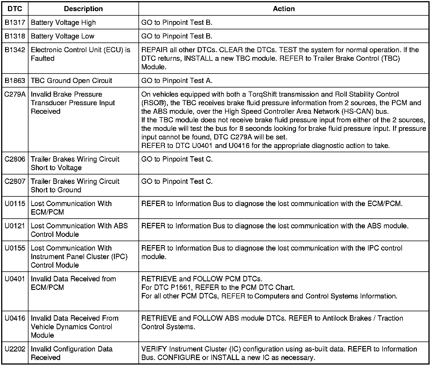 Trailer Brake Control (TBC) Module DTC Chart
