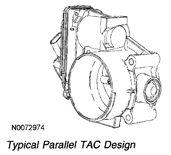 The electronic TAC is a DC motor controlled by the PCM. There are 2 designs for the TAC, parallel and in-line. The parallel design has the motor under the bore parallel to the plate shaft. The motor housing is integrated into the main housing. The in-line design has a separate motor housing. An internal spring is used in both designs to return the throttle plate to a default position. The default position is typically a throttle angle of 7 to 8 degrees from the hard stop angle. The closed throttle plate hard stop is used to prevent the throttle from binding in the bore. This hard stop setting is not adjustable and is set to result in less airflow than the minimum engine airflow required at idle. For additional information, refer to Torque Based Electronic Throttle Control (ETC). Description and Operation