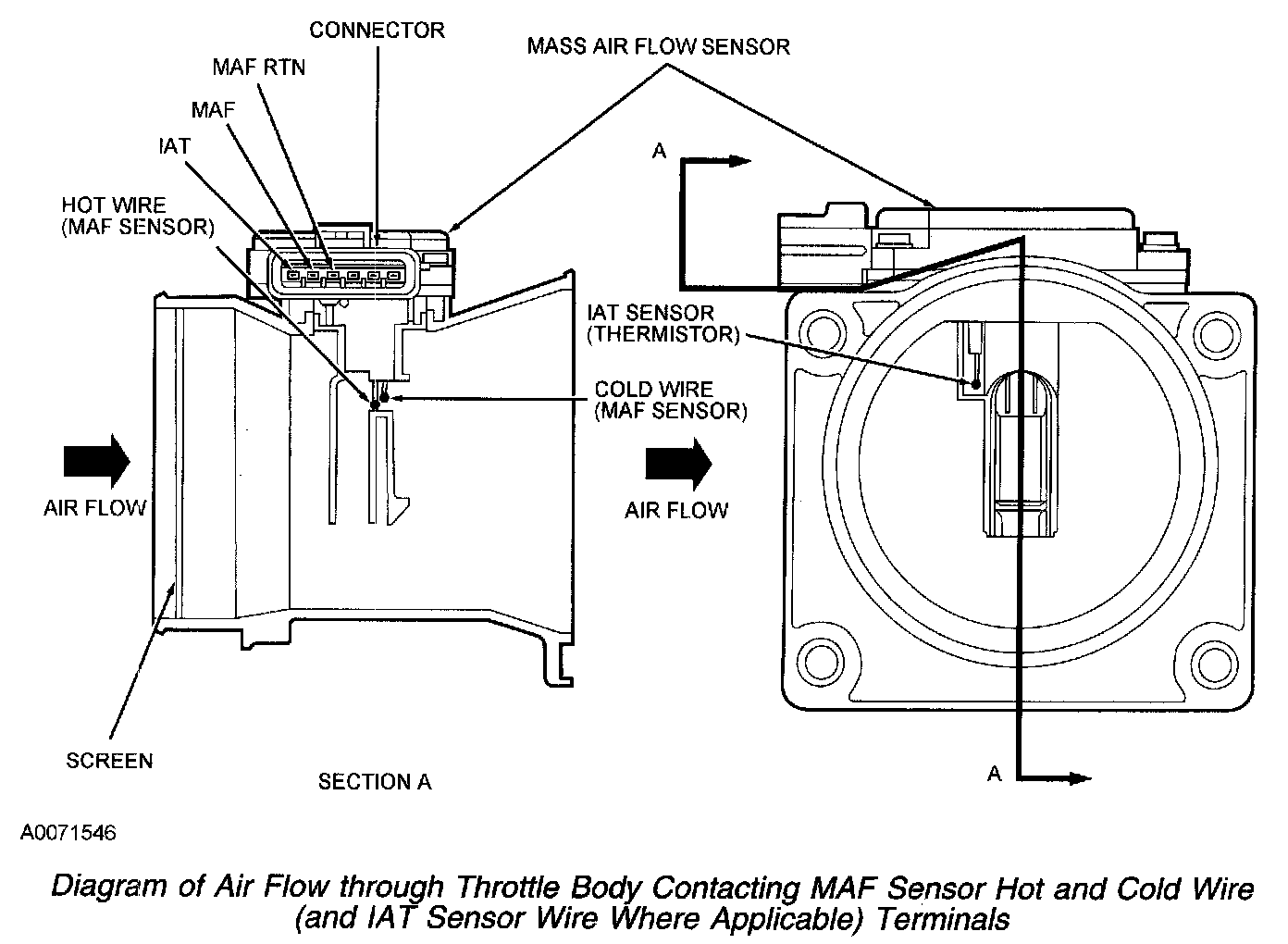 Diagram Of Air Flow Through Throttle Body Contacting MAF Sensor Hot And Cold Wire (and IAT Sensor Wire Where Applicable) Terminals: