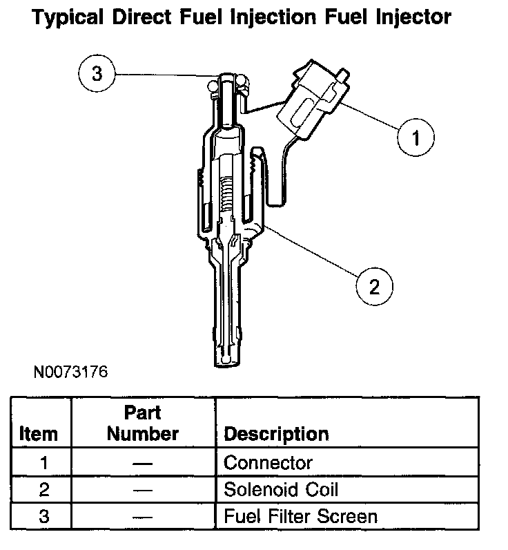 The gasoline direct fuel injection fuel injector delivers fuel directly into the cylinder under high pressure. Each injector is controlled by 2 circuits from the PCM.