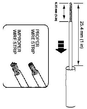 2. Strip 6.35mm (1/4 in) of insulation from each wire end, taking care not to nick or cut wire strands.