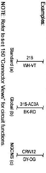 Connector Views show the views of the pins and/or cavities of all connectors. The pin and cavity sides are shown separately as if the connector were disconnected. The color of the connector housing is indicated next to the connector number when available. The harness causal number is located above the connector view and below the connector number. The circuit function charts are located below each connector. The wiring harness designations are listed in Component Location Charts.